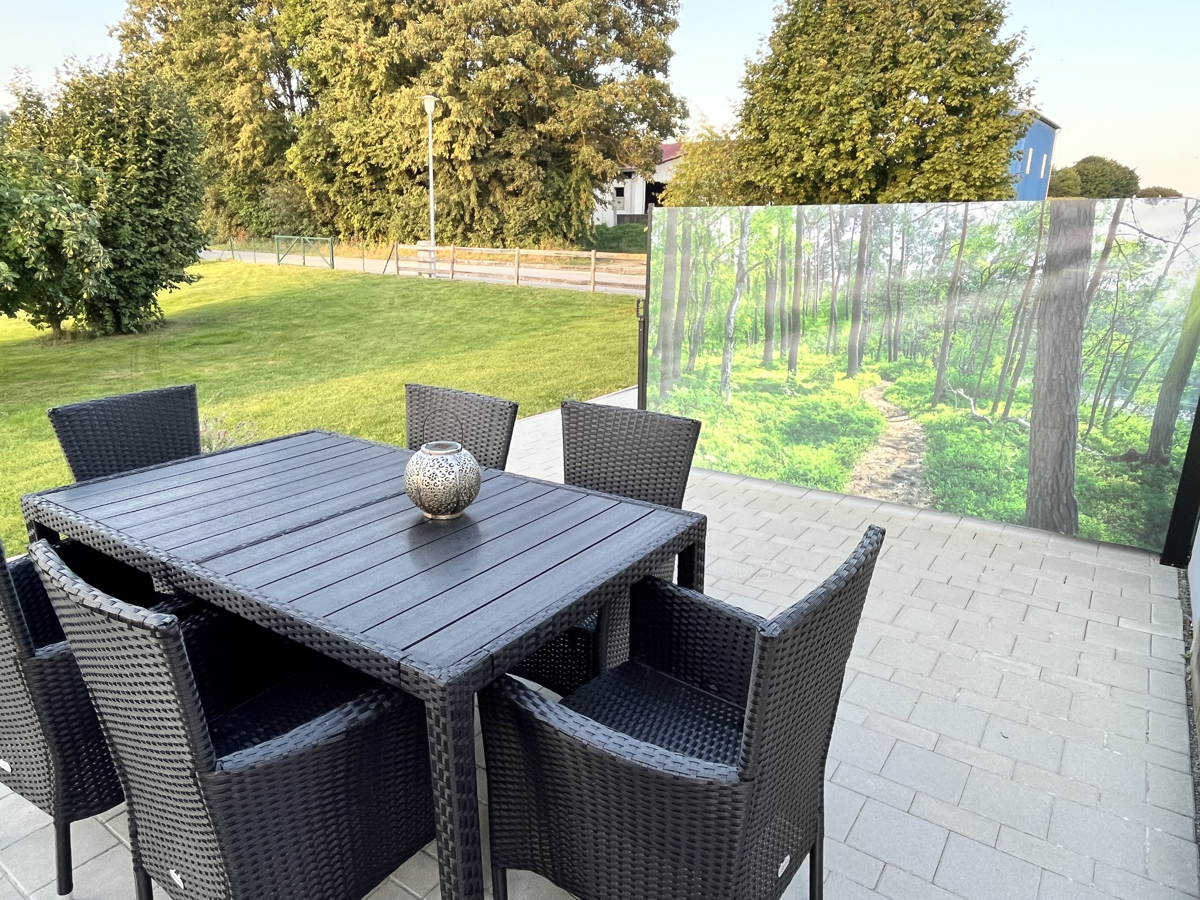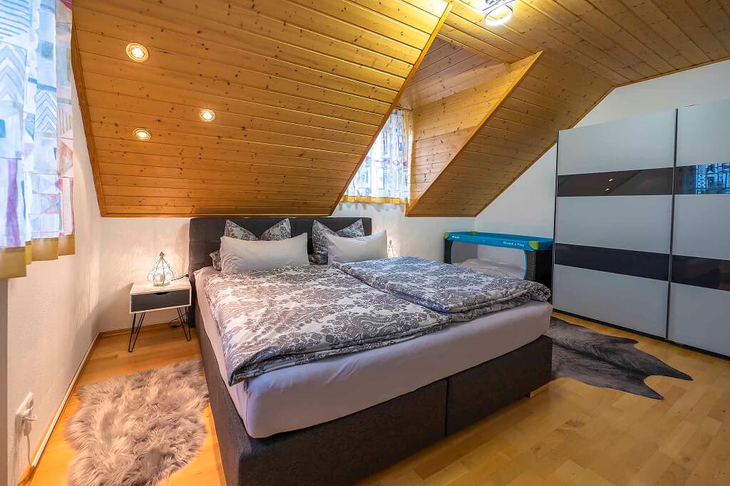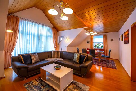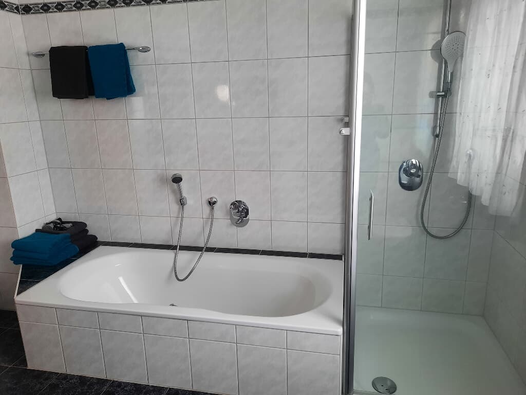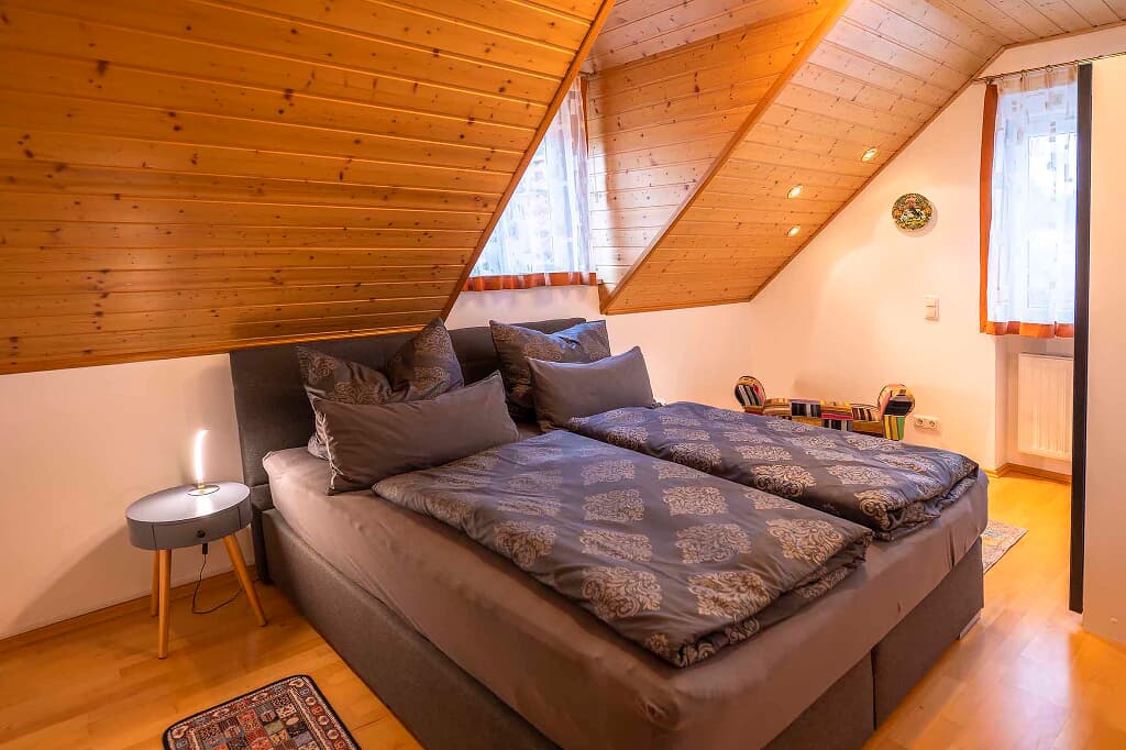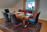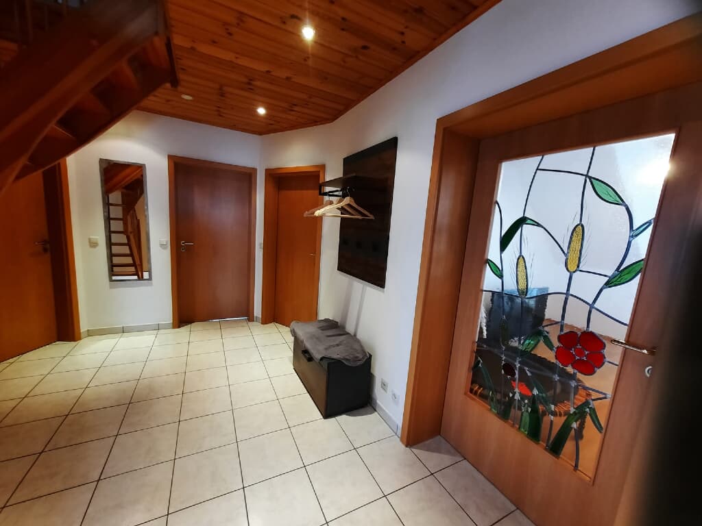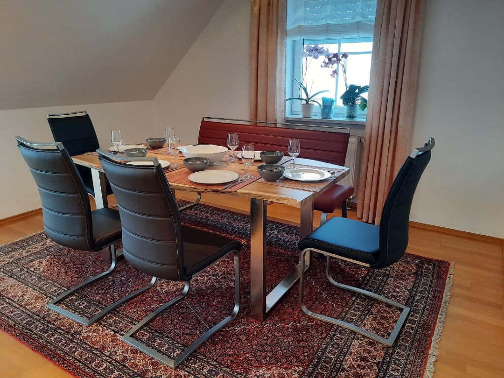 Unsere stylisch und behaglich eingerichtete Ferienwohnung im 1. Stock mit 132 qm Wohnfläche bietet über 2 Etagen Platz für 2- 6 Personen. Das großzügige Wohnzimmer mit Leder-Ecksofa, Flachbild-TV, Bluetooth Lautsprecher und gemütlichem Esszimmer lädt zum Verweilen ein. Die komplett ausgestattete Küche mit Geschirrspüler, Kühl- und Gefrierschrank, Herd, Backofen, Mikrowelle, Brotschneidemaschine, Kaffeevollautomat und Kaffeemaschine, Toaster, Eierkocher, Mixer usw. und vielfältigem Geschirr lässt keine Wünsche offen. Die Ferienwohnung ist mit 3 Schlafzimmern mit Doppel-Boxspringbett ausgestattet. Das 3. Schlafzimmer befindet sich in der 2. Etage mit 2 getrennten Betten. Das geräumige Badezimmer bietet Ihnen Dusche und Badewanne, Fön ist vorhanden. Zusätzlich gibt es ein separates WC. Toilettenpapier, Müllbeutel, Spülmaschinentabs sowie ein Grundsortiment an Gewürzen ist inclusive. Ein Saugroboter sorgt für eine immer saubere Wohnung während Ihres Aufenthaltes. Waschmaschine und Trocker stehen bei Bedarf zur Verfügung. Die Wohnung ist Allergiker freundlich und eine Nichtraucherwohnung. Der großzügige Garten lädt zum Relaxen und Sonnenbaden und Grillen auf eigener Terrasse ein. WLAN und Parkplatz können sie kostenfrei benutzen. Der Parkplatz ist mit einer Elektroladetankstelle (Wallbox mit AC Laden) ausgestattet. Hier können Sie nachhaltigen Strom aus unserer hauseigenen Photovoltaikanlage aufladen. Radfahrer und Motorradfahrer sind Herzlich Willkommen. Hier steht zum Abstellen eine Garage zur Verfügung.