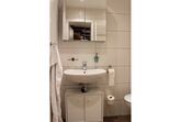 Badezimmer mit WC, Glasdusche und Waschbecken, Handtuchheizkörper, Föhn und Kosmetikspiegel