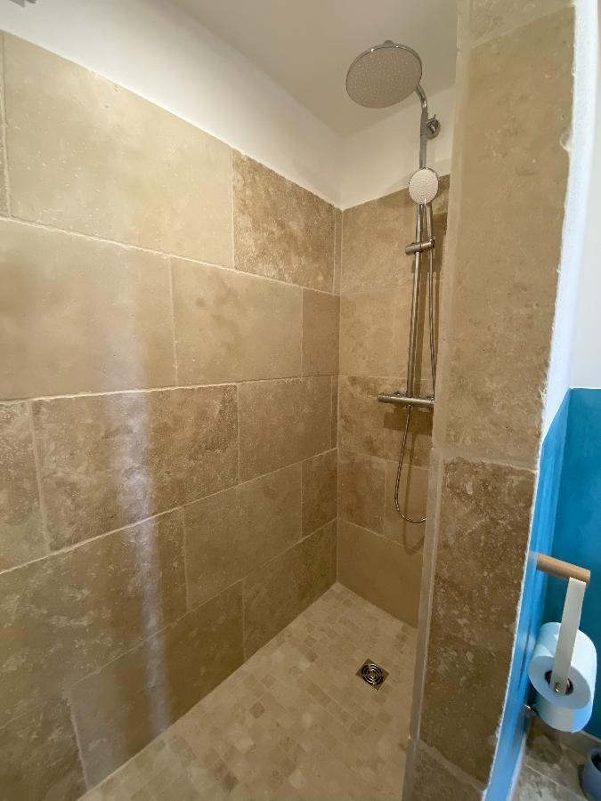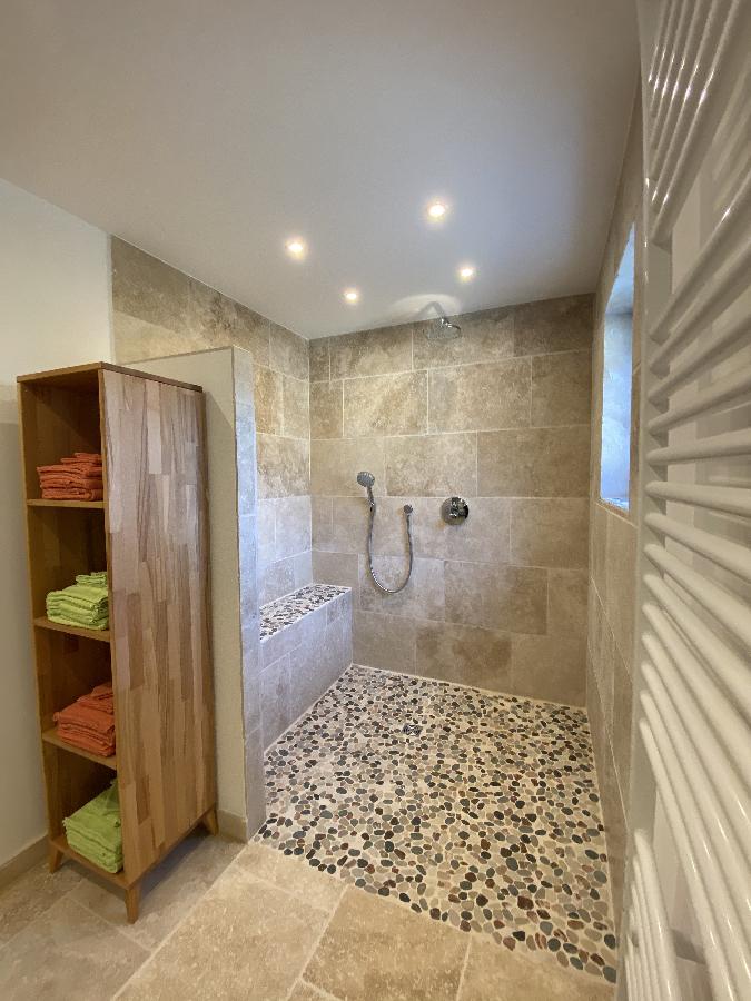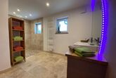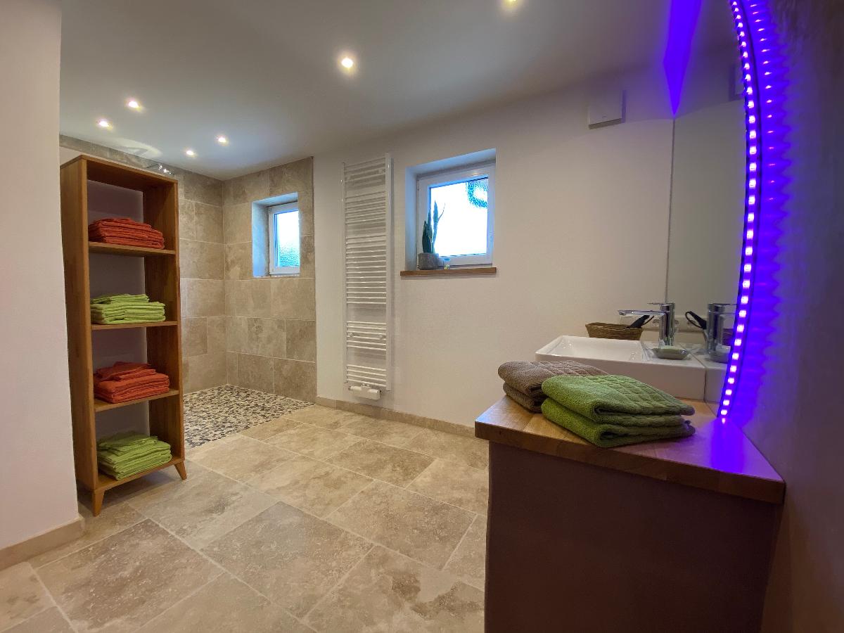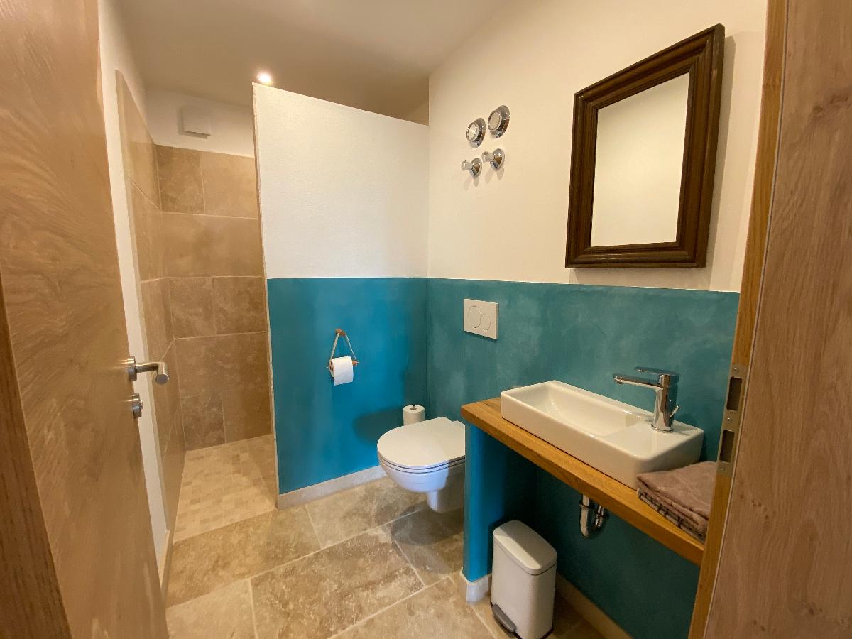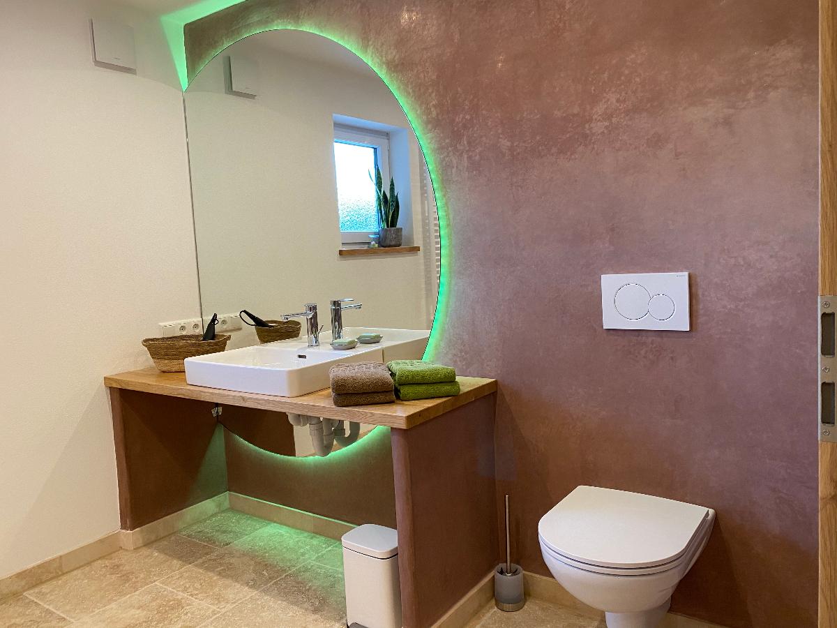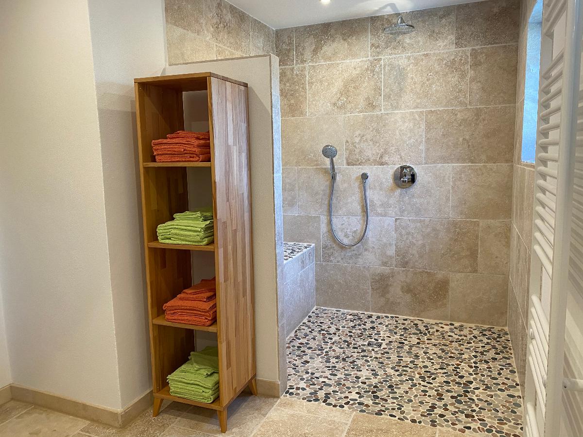 Die Ferienwohnung verfügt über zwei Bäder. Ein Bad ist mit großer, leicht zugänglicher Dusche, die auch für Rollstuhlfahrer geeignet ist, ausgestattet. Das Waschbecken ist unterfahrbar, und das WC mit Haltegriffen versehen. Im zweiten Bad befindet sich ebenfalls eine Dusche, Waschbecken und WC.