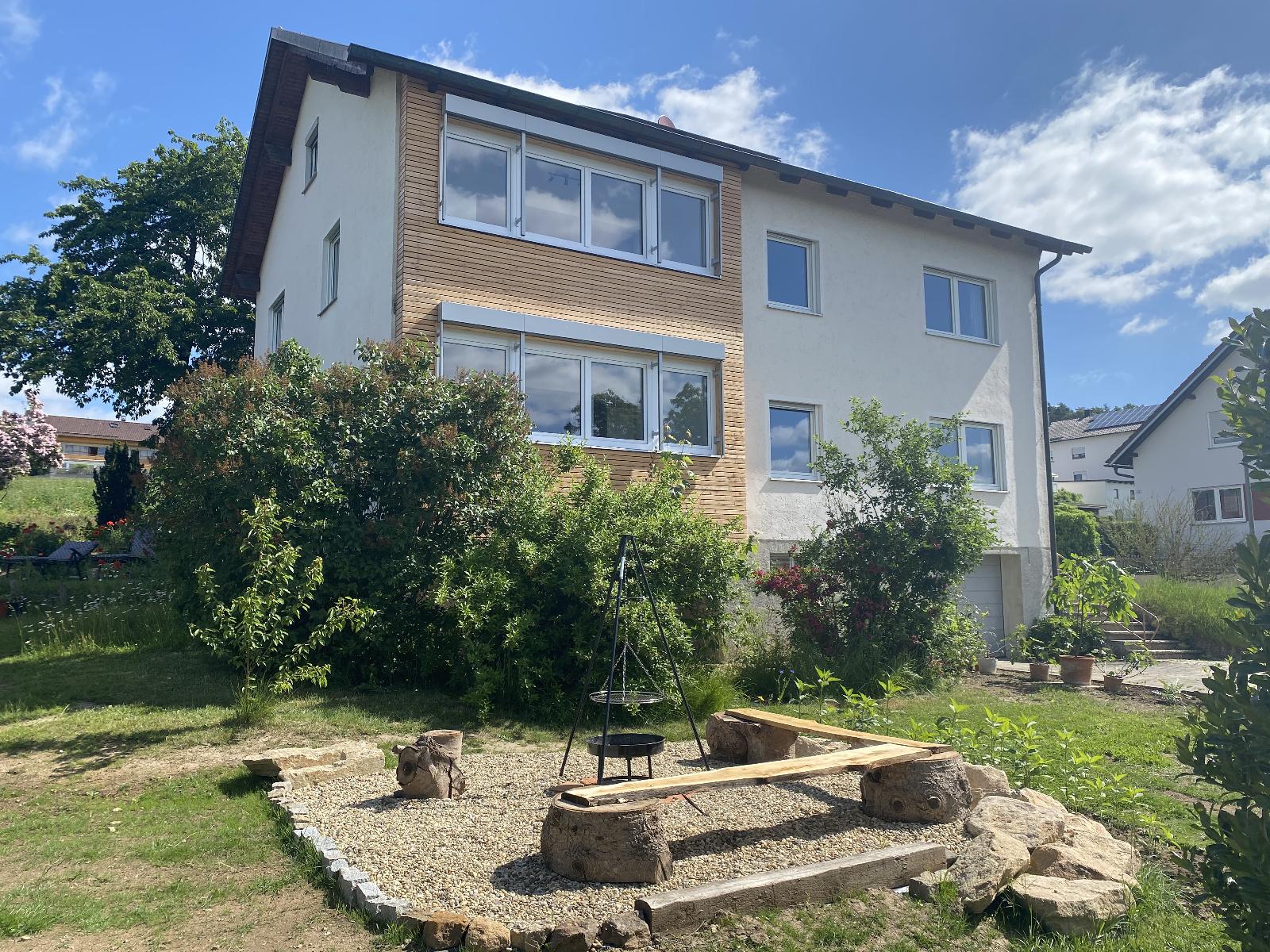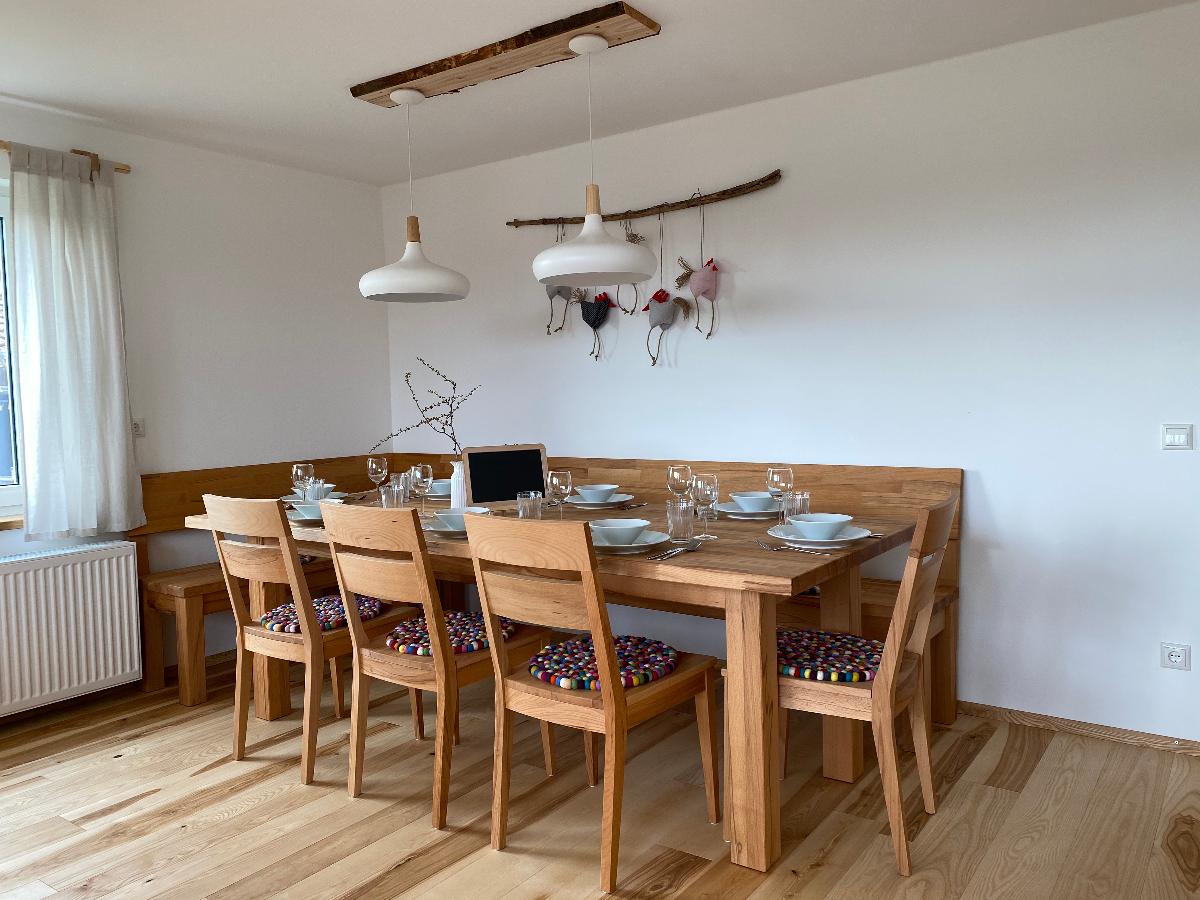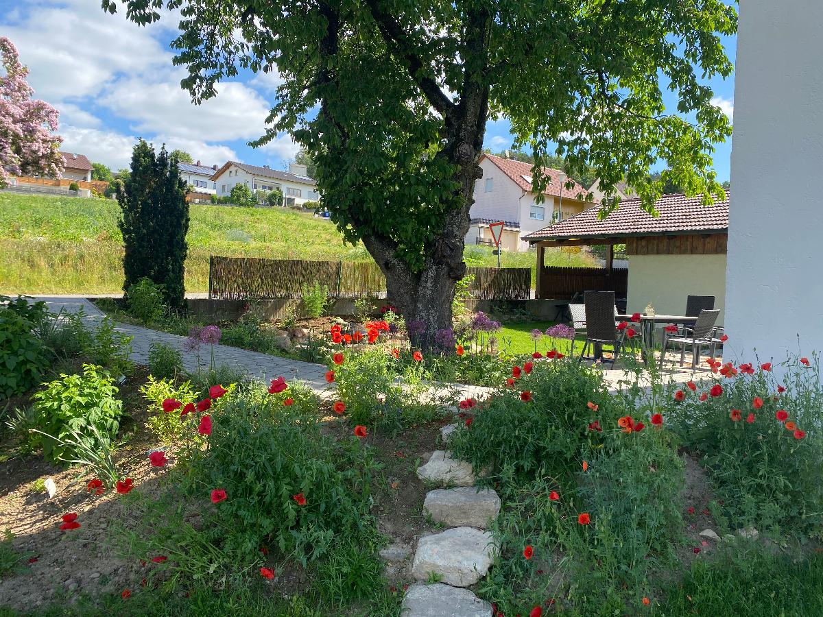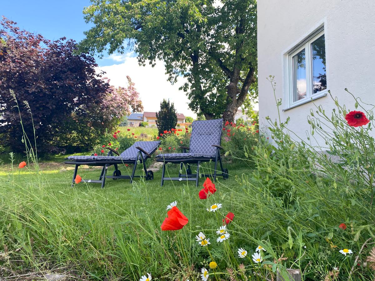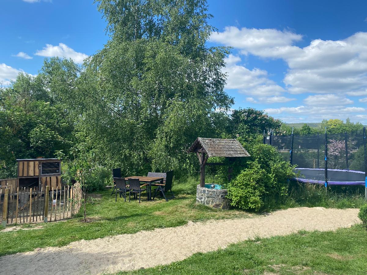Die Ferienwohnung Vogelsang liegt im Erdgeschoss und hat direkten Zugang zu einem eigenen Gartenbereich mit eigener Terrasse und Grillplatz. Auch ein kleiner Spielbereich im Freien für Kinder ist vorhanden. Im gemeinsamen Garten ist Abwechslung durch ein Kleintiergehege, Boccia-Bahn und ein Trampolin gegeben. Außerdem lädt der Garten zum Naschen von Obst und Gemüse ein.