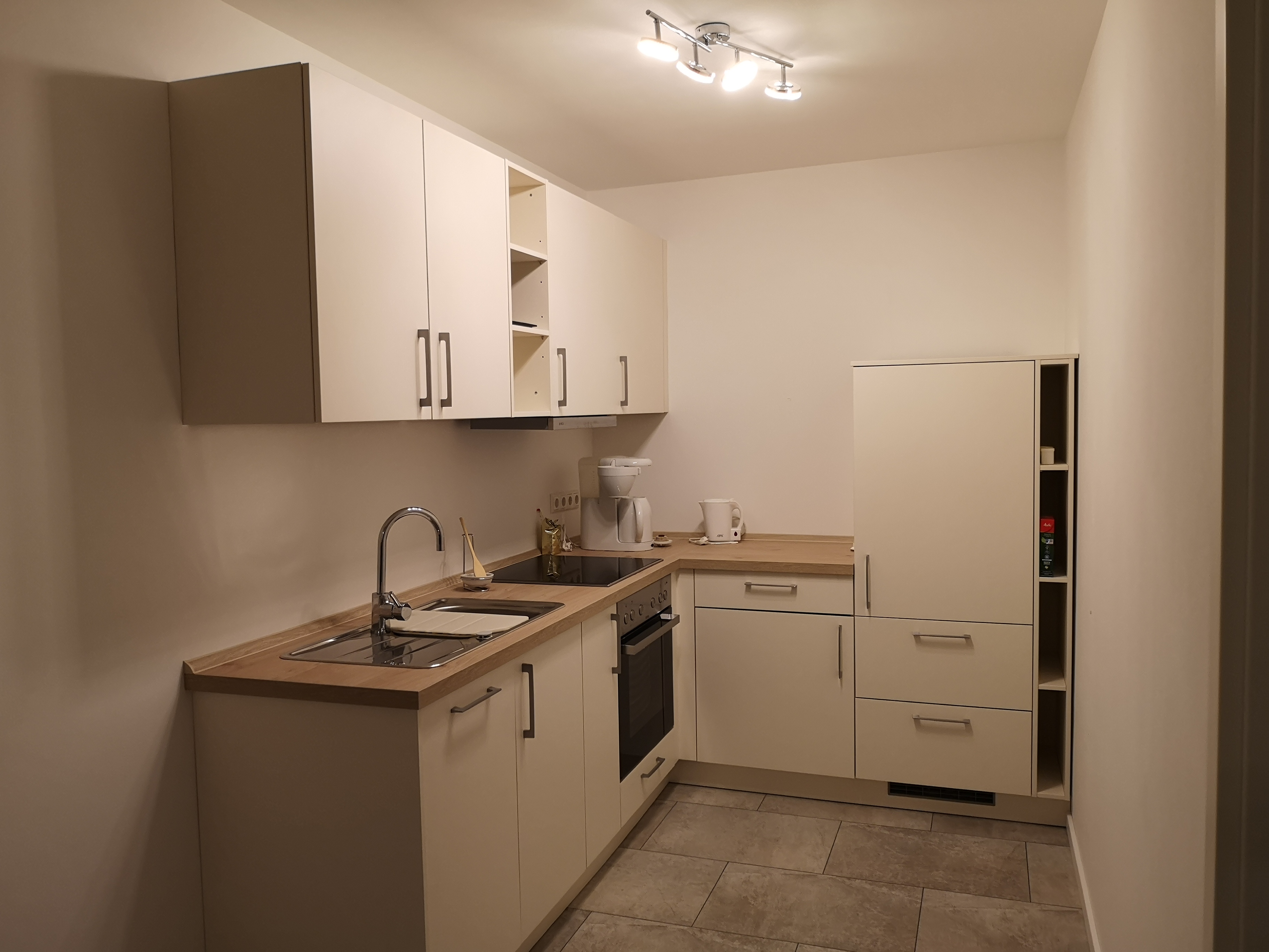 Neue Einbauküche mit Spülmaschine, Elektroherd mit 4-Platten, Backofen Kühlschrank & Ausstattung. Sitzecke im Eingangsbereich und modern gefliestes Bad mit Dusche & WC.