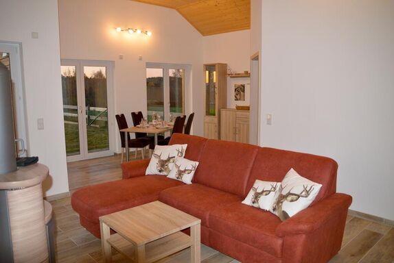 Das gemütliche Wohnzimmer mit TV, Couch und Schwedenofen lädt zu gemütlichen Fernseh- oder Spieleabenden ein. Das Holz für den Ofen kann entweder direkt vor Ort oder im nächsten Baumarkt erworben werden.