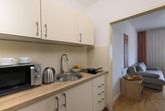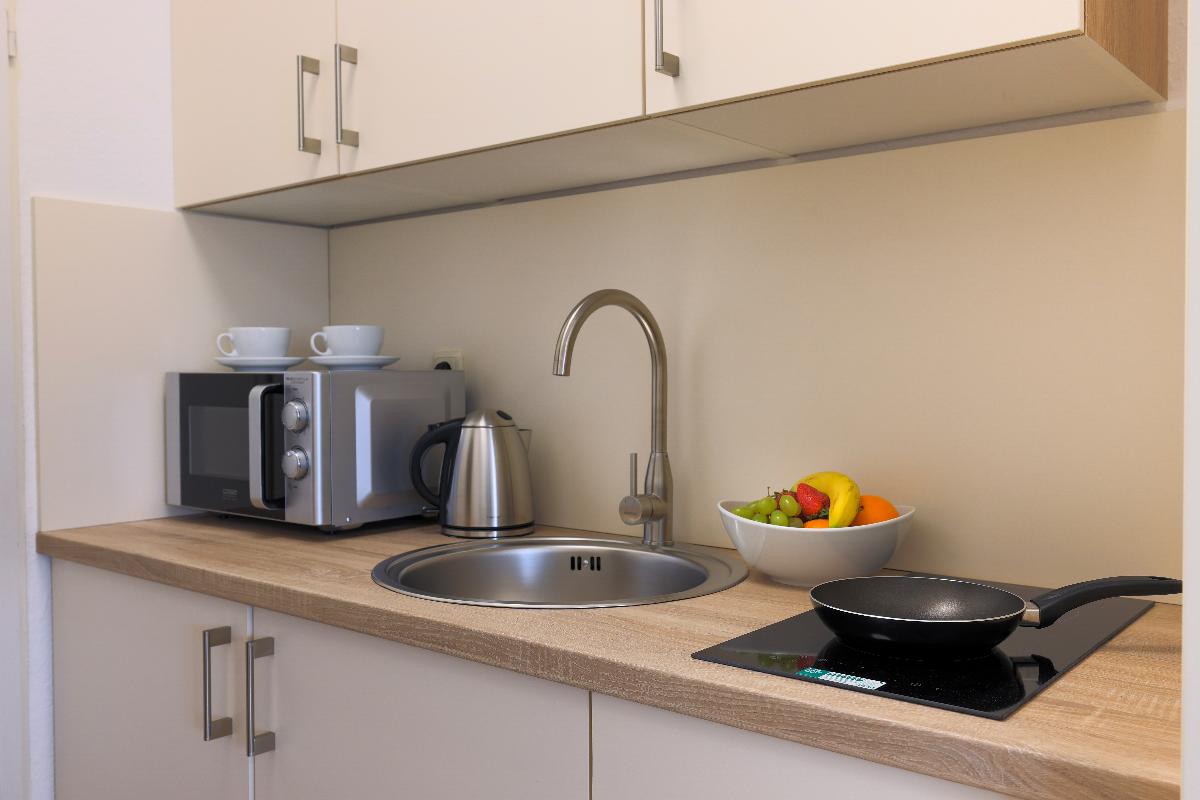 Mikrowelle, Wasserkocher und Kühlschrank stehen zur Verfügung.