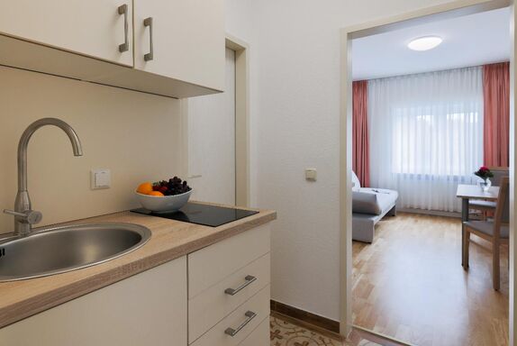 Dieses Appartement bestehet aus einem Schlafzimmer mit Aufenthaltsbereich, Küchenzeile und Bad. Perfekt für Sie und Ihre Kids.