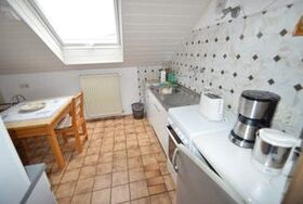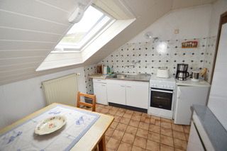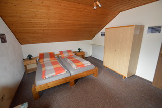 Die Ferienwohnung befindet sich in der oberen Etage und bietet auf 80 Quadratmetern Platz für bis zu 4 Personen. Sie verfügt über eine Küche, ein Wohnzimmer, zwei Schlafzimmern sowie ein Badezimmer. Die Küche ist mit Wasserkocher, Kaffeemaschine, Herd, Kühlschrank, Backofen, Toaster und Geschirrhandtüchern voll ausgestattet. Der Wohn- und Essbereich verfügt über einen Flachbildschirm, CD-Player mit Radio, Teppichboden, Doppelcouch mit 2 Sesseln sowie einen runden Esstisch mit 4 Stühlen.