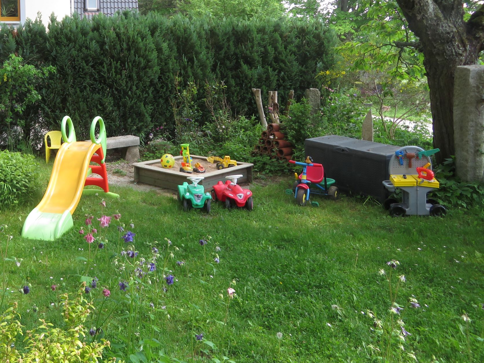 ✔ Wiesenlabyrinth, Bolzplatz, Basketballkorb, Kinderspielhaus, Sandkasten/-spielsachen, Bobby Cars, Dreirad etc.