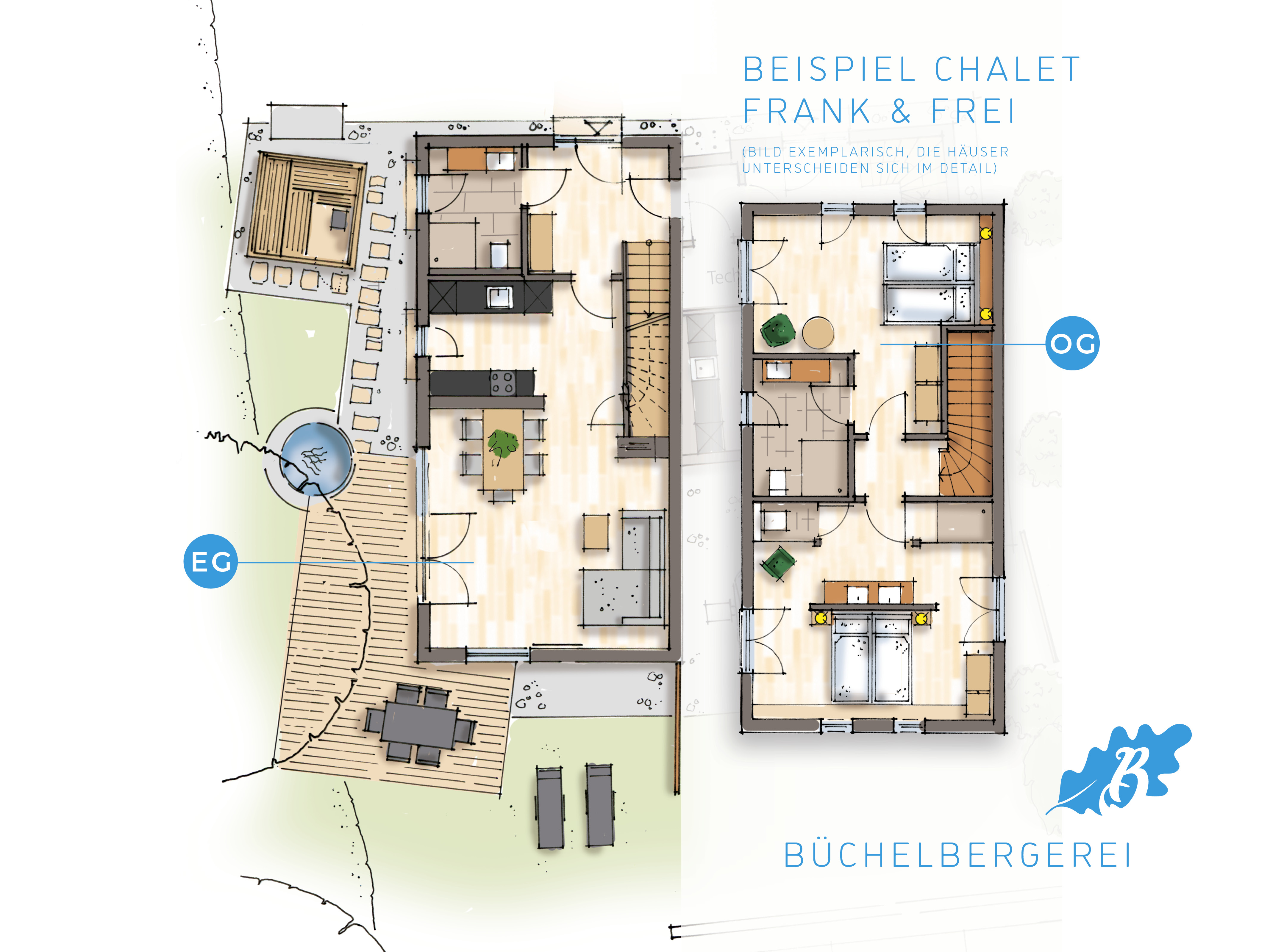 - Je nach Haus entweder Sauna-Cube außen mit Sauna-Dusche im Chalet-EG, Innensauna mit Dusche mit Extra-Zugang über Terrasse oder Innensauna mit Dusche im EG
