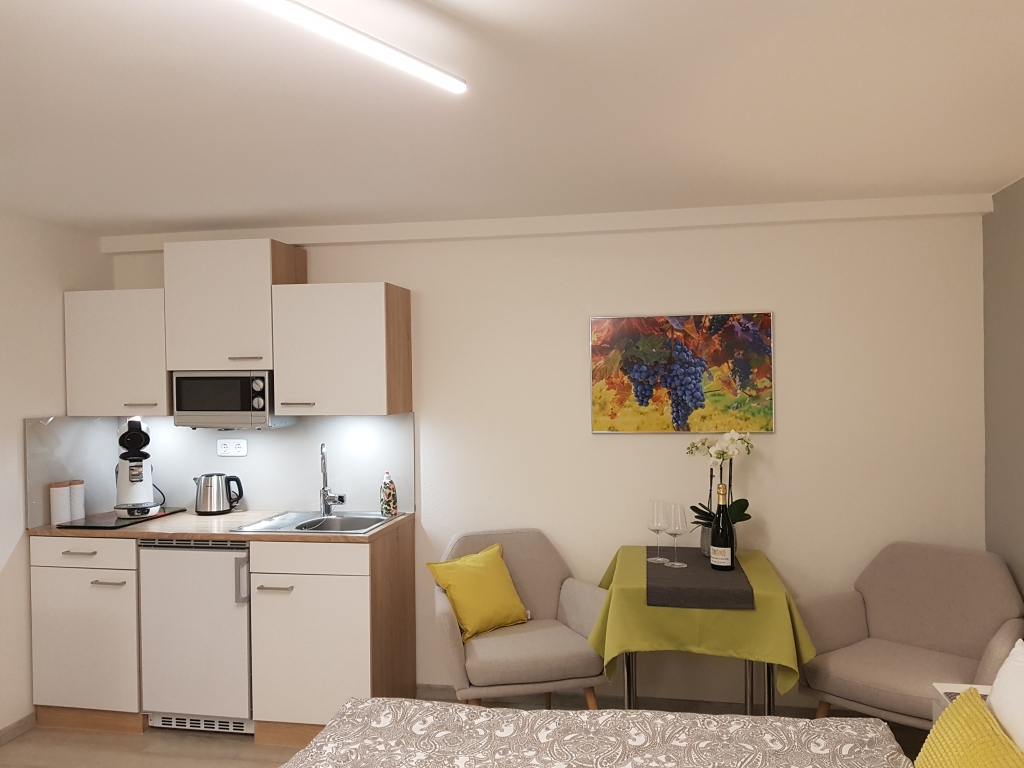 Wir bieten 1 Doppelzimmer (Zustellbett möglich oder auch als EZ buchbar) mit Mini-Küche, Terrasse und Dusche/WC/Fön. Kostenfreies Lan/Wlan & TV (Magenta). Im Zimmer stehen Wasserkocher und Kaffeemaschine für Sie bereit, täglich Kaffee/Tee und eine Flasche Mineralwasser zur freien Verfügung.