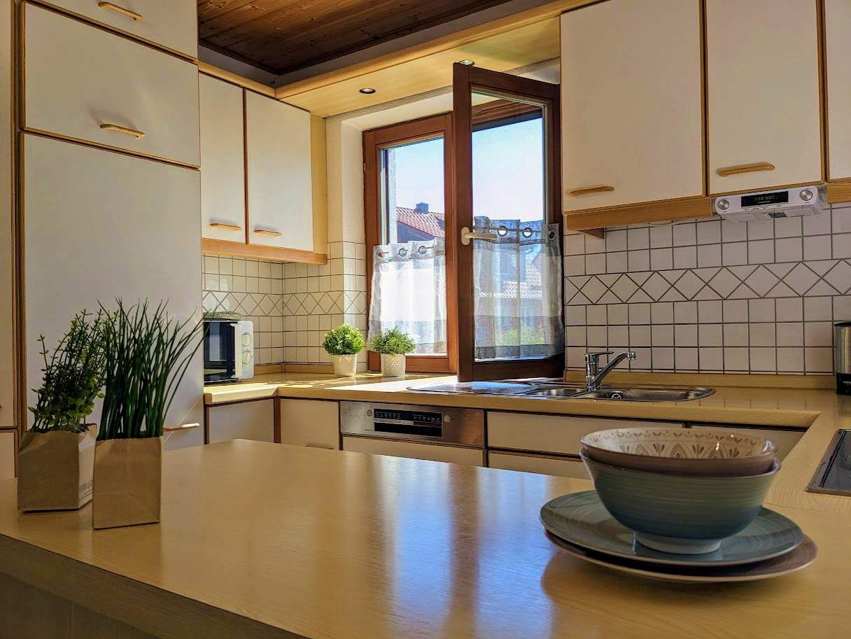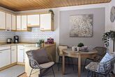 • Voll ausgestattete Wohnküche mit Esstisch, Backofen, Kühlschrank, Mikrowelle und Geschirrspüler sowie Toaster, Kaffeemaschine und Wasserkocher.