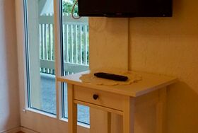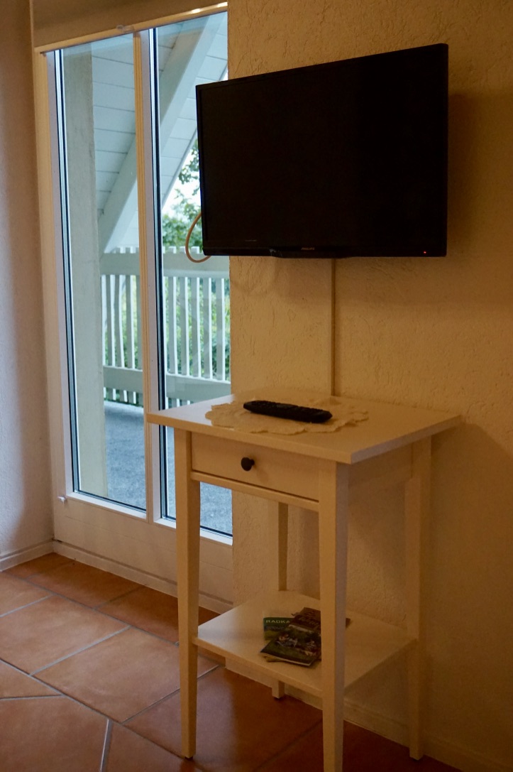Der gemütliche Wohn-/Schlafraum mit Fliesenboden besteht aus einem Schlafsofa mit ausziehbaren Matratzen (1,60m x 2,00m), einem Essplatz, Garderobe, Flachbild-TV, W-Lan.