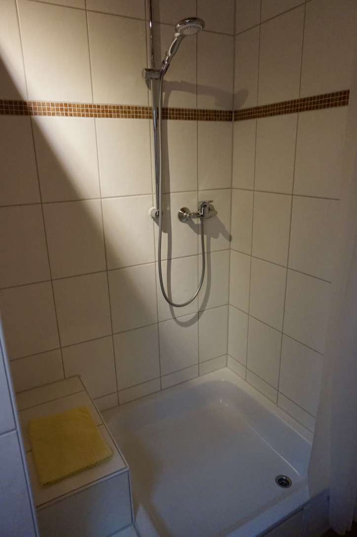 Im hellen, freundlichen Bad befinden sich eine Dusche, ein WC, ein Waschtisch sowie ein Haartrockner.