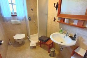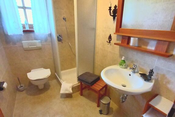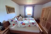 Schlafzimmer mit Doppelbett. Das Bad verfügt über eine Dusche, ein WC