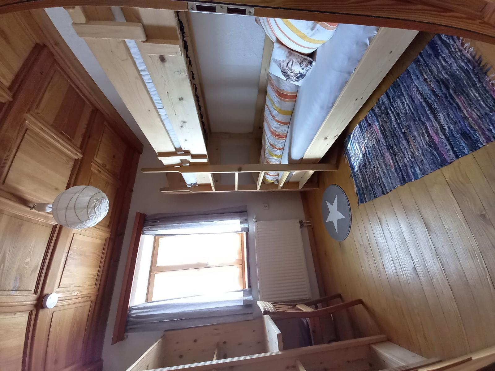 Wohnbereich (Sat-TV).Ein Schlafzimmer mit Doppelbett und ein weiters mit Stockbetten. Das Bad verfügt über eine Dusche, ein WC sowie ein