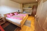 Schlafzimmer mit Doppelbett. Das Bad verfügt über eine Dusche, ein WC