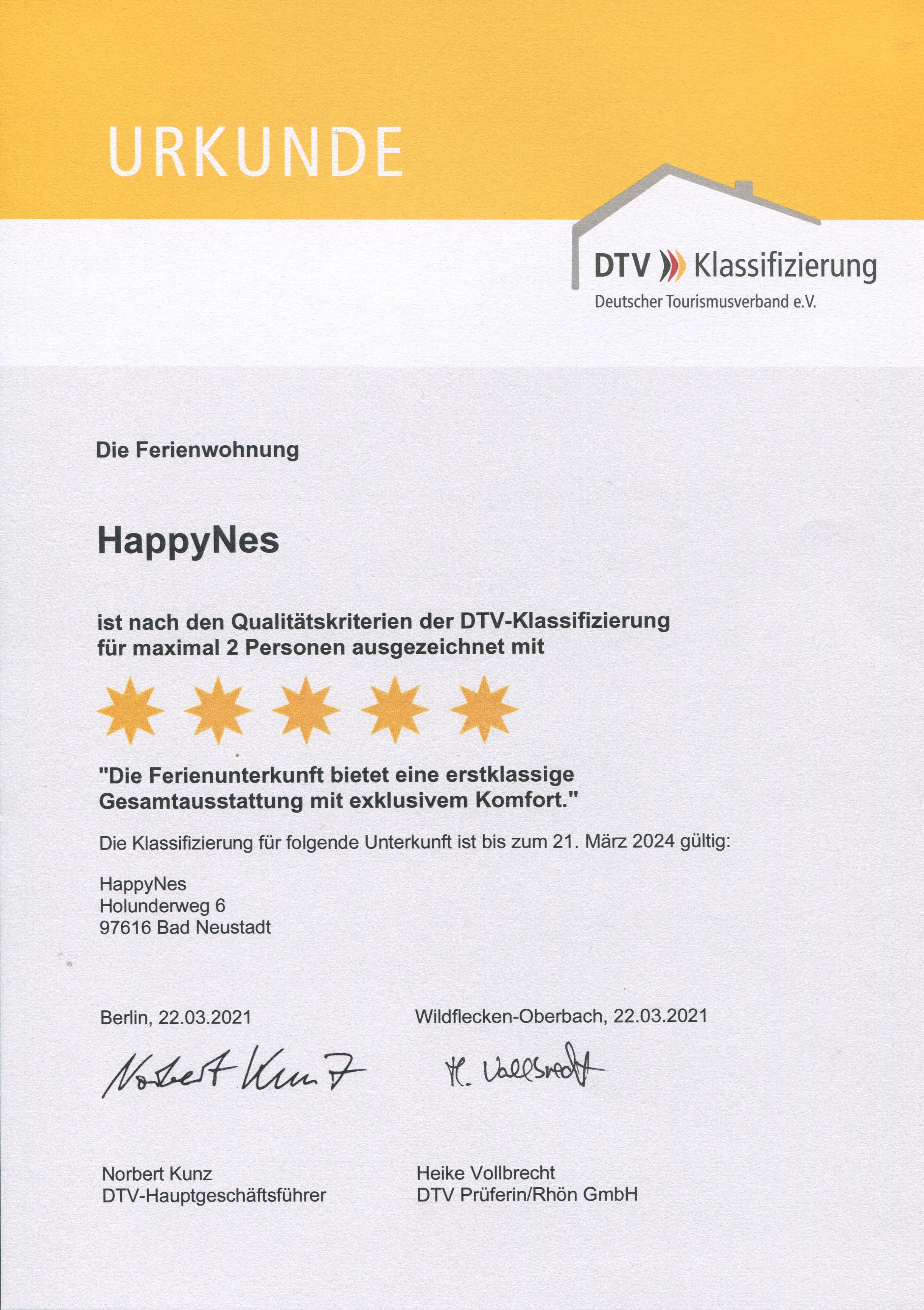 Meine beiden Ferienwohnungen sind nach dem DTV klassifiziert und mit der Höchstnote von 5 Sternen ausgezeichnet worden. Die modernen Wohnungen mit gehobener Austattung befinden sich im Stadtteil Mühlbach. Die Ferienwohnungen sind Baujahr 2017 und befinden sich in Bestlage.