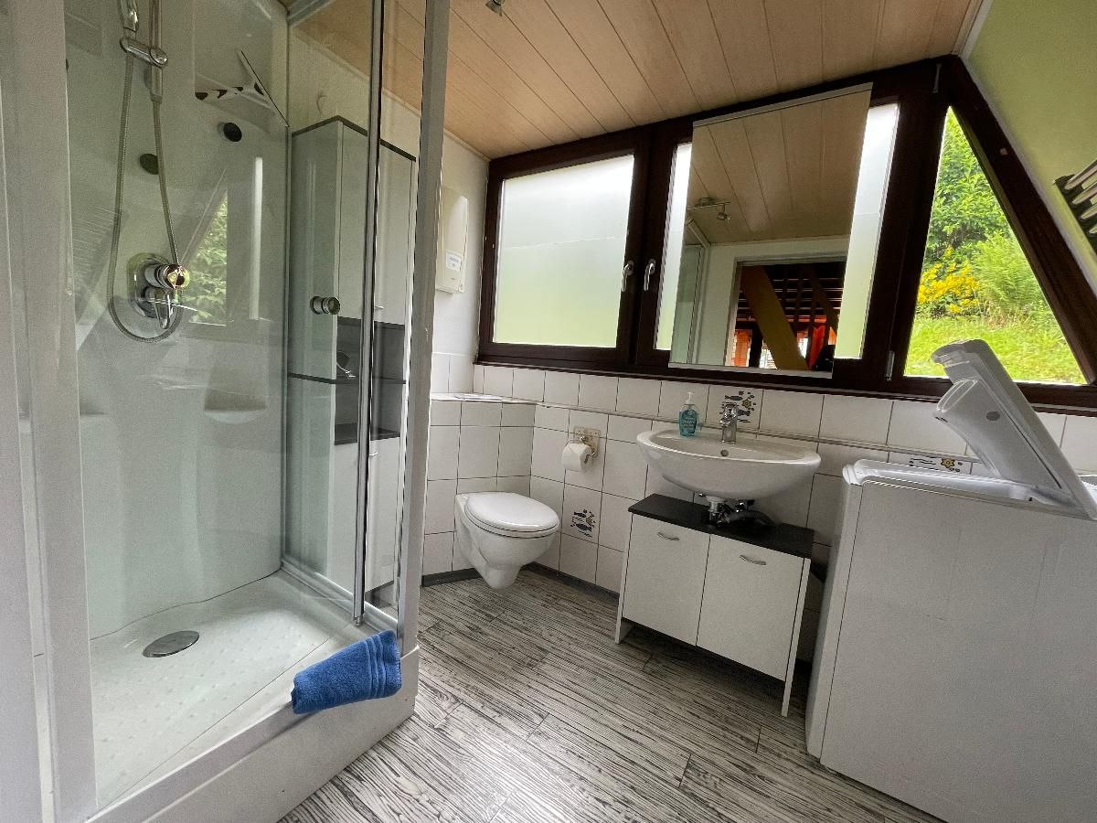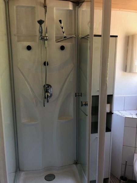 Wellness-Dusche, WC, Waschbecken, großer Spiegel, elektronischer Durchlauferhitzer, Haartrockner, Handtuchheizkörper, Waschmaschine