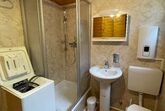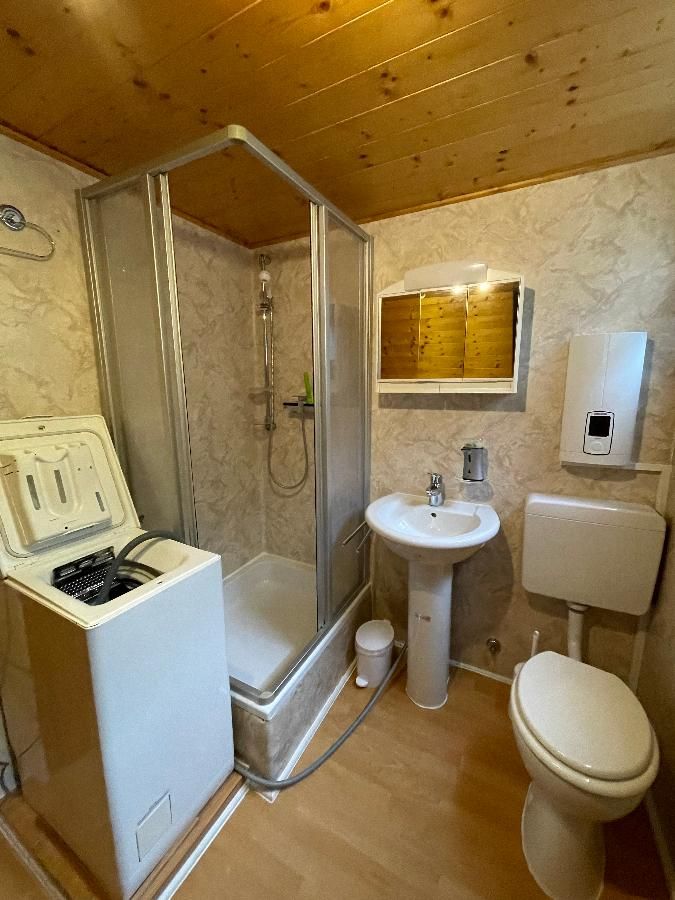 Dusche, WC, Waschbecken, Spiegel, elektronischer Durchlauferhitzer, Haartrockner, Heizkörper aus Stein, Schnellheizer, Waschmaschine, Schrank