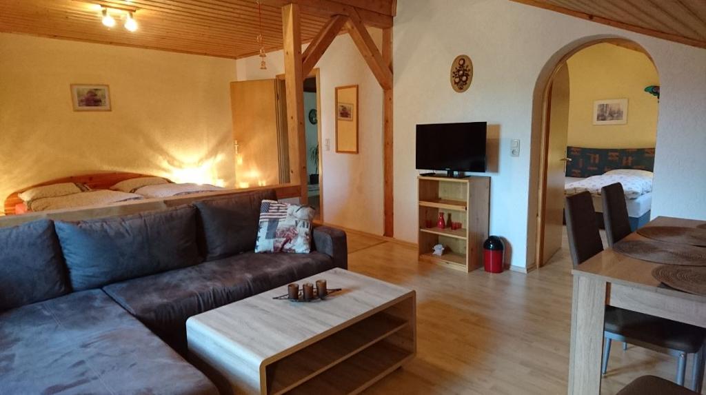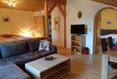 Die geräumige Ferienwohnung ist durch den Dachgeschosscharakter besonders gemütlich. Sie verfügt über 2 Schlafzimmer mit je einem Doppelbett, einer Küche, einem Wohnzimmer mit Essecke und einem großen Bad mit Dusche und WC.