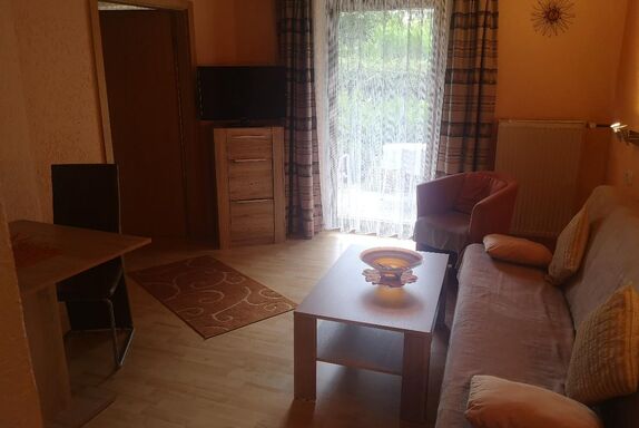 Die Ferienwohnung befindet sich im 1 Stock und verfügt über einen Balkon mit Blick zum Gartenteich. Sie verfügt über eine separate Küche, Elternschlafzimmer, Kinderzimmer (Etagenbett), Wohnzimmer und Bad mit Dusche und WC. Bei dieser Ferienwohnung gibt es die Möglichkeit, das direkt danebenliegende DZ mit eigener Dusche und WC z.B. für Großeltern zuzubuchen. Der Balkon für die Ferienwohnung und dieses DZ bilden eine Einheit.