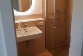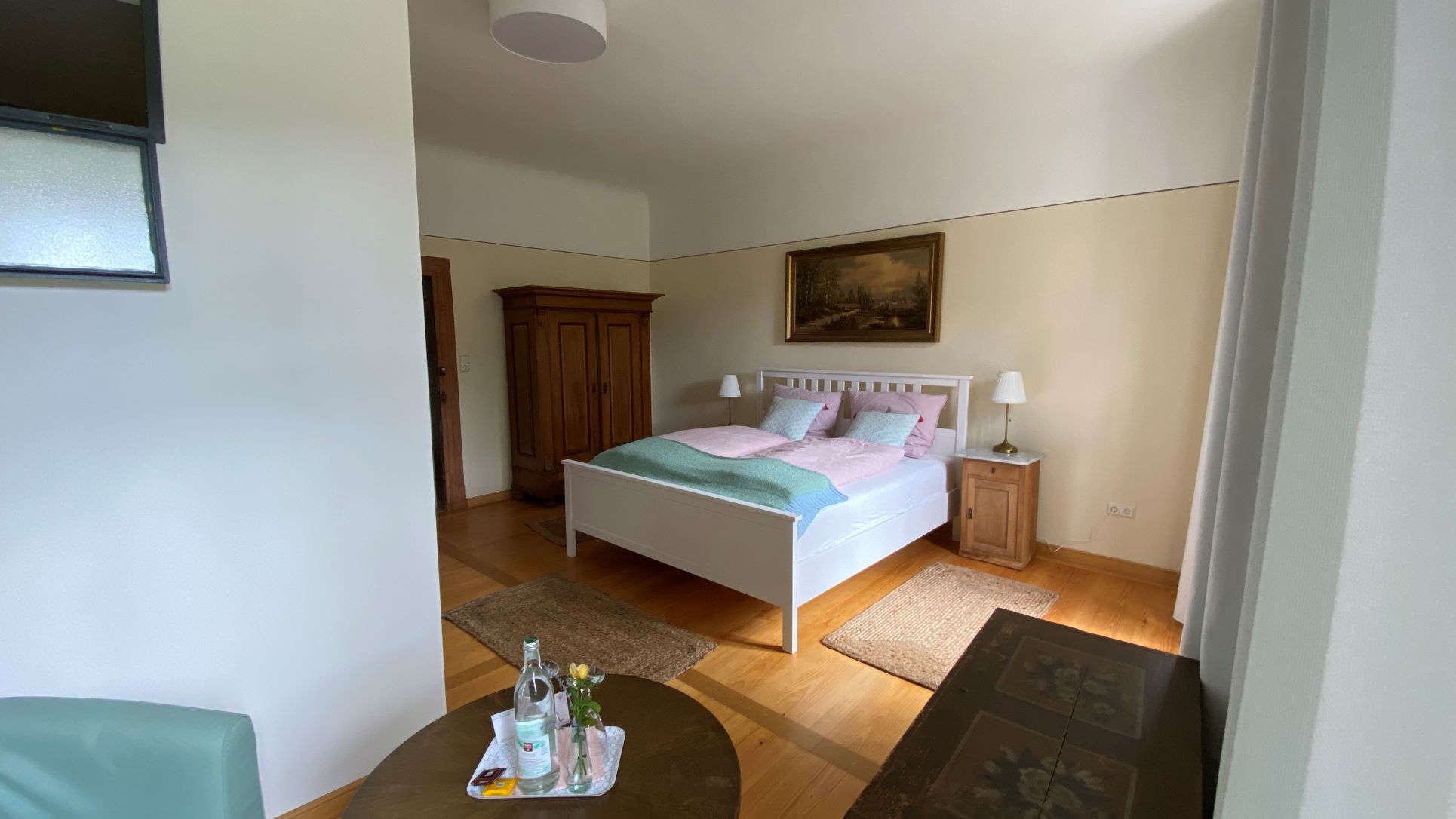 Ebenfalls im Obergeschoß ist unser Doppelzimmer Gerold (27qm) auch hier ist der Blick auf die Streuobstwiese und den Elsbach einfach nur wundervoll. Mit sanften gelb und grün Tönen fühlen Sie sich direkt wohl und gut aufgehoben. Bei der Einrichtung haben wir viel Wert auf die Mischung aus modernen & funktionalen Elementen gelegt. Diese werden durch wunderschöne Antiquitäten ergänzt. Das Doppelbett ist 180x200 breit, Sitzgelegenheit bieten 2 Sessel. Das Badezimmer mit Dusche fügt sich harmonisch ein.