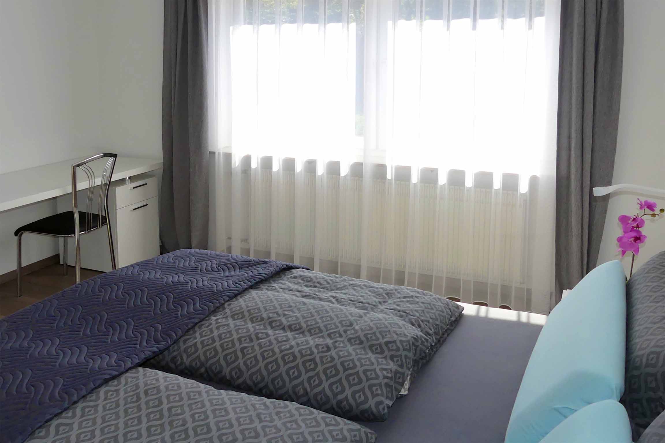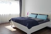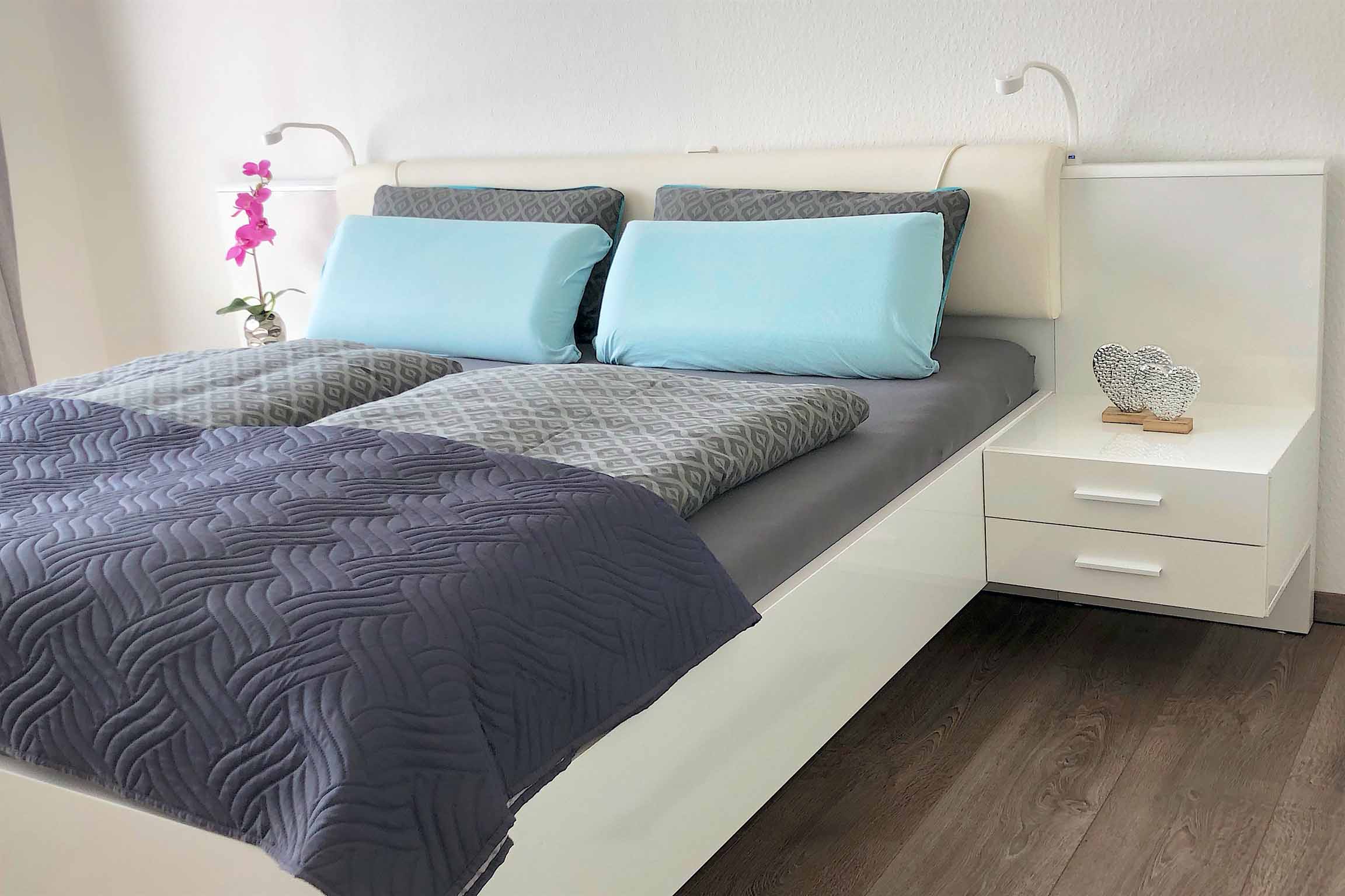 Schlafen: bequemes, großes Doppelbett, Kleiderschrank mit viel Stauraum, 2 Schiebetüren für bequemes öffnen und zusätzlich Platz für Tagesgarderobe an der Stirnseite, kompakter (Schreib-)Tisch für Notizen etc., Nachtischlampen mit USB-Ladebuchse, Bettwäsche.