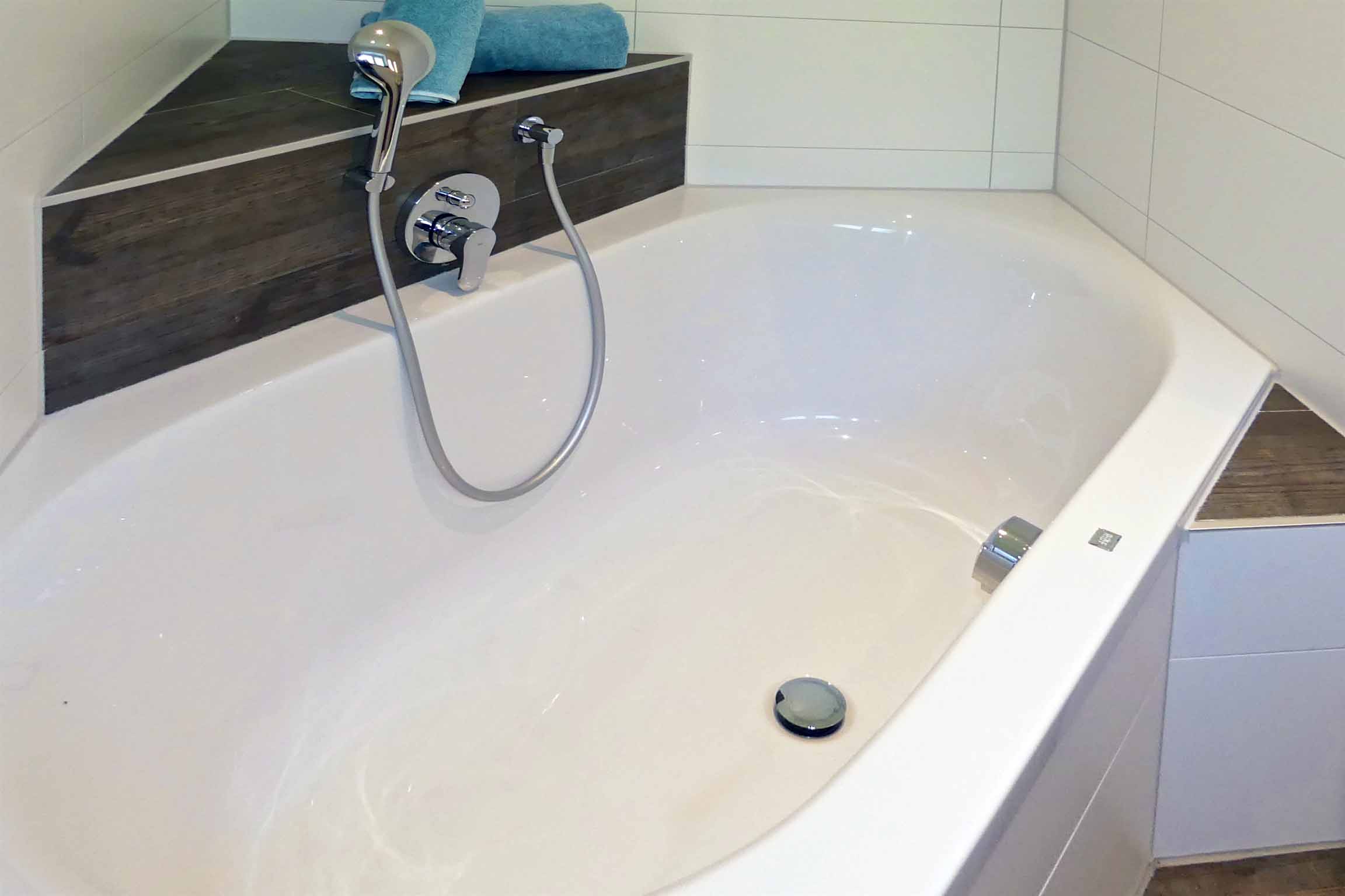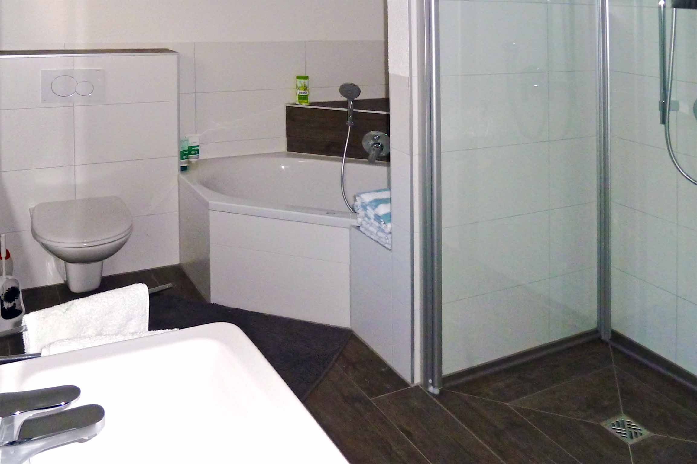 Badezimmer: separate ebenerdige Dusche, Kurzbadewanne, Waschtisch, WC, Waschmaschine, Dusch- und Handtücher.