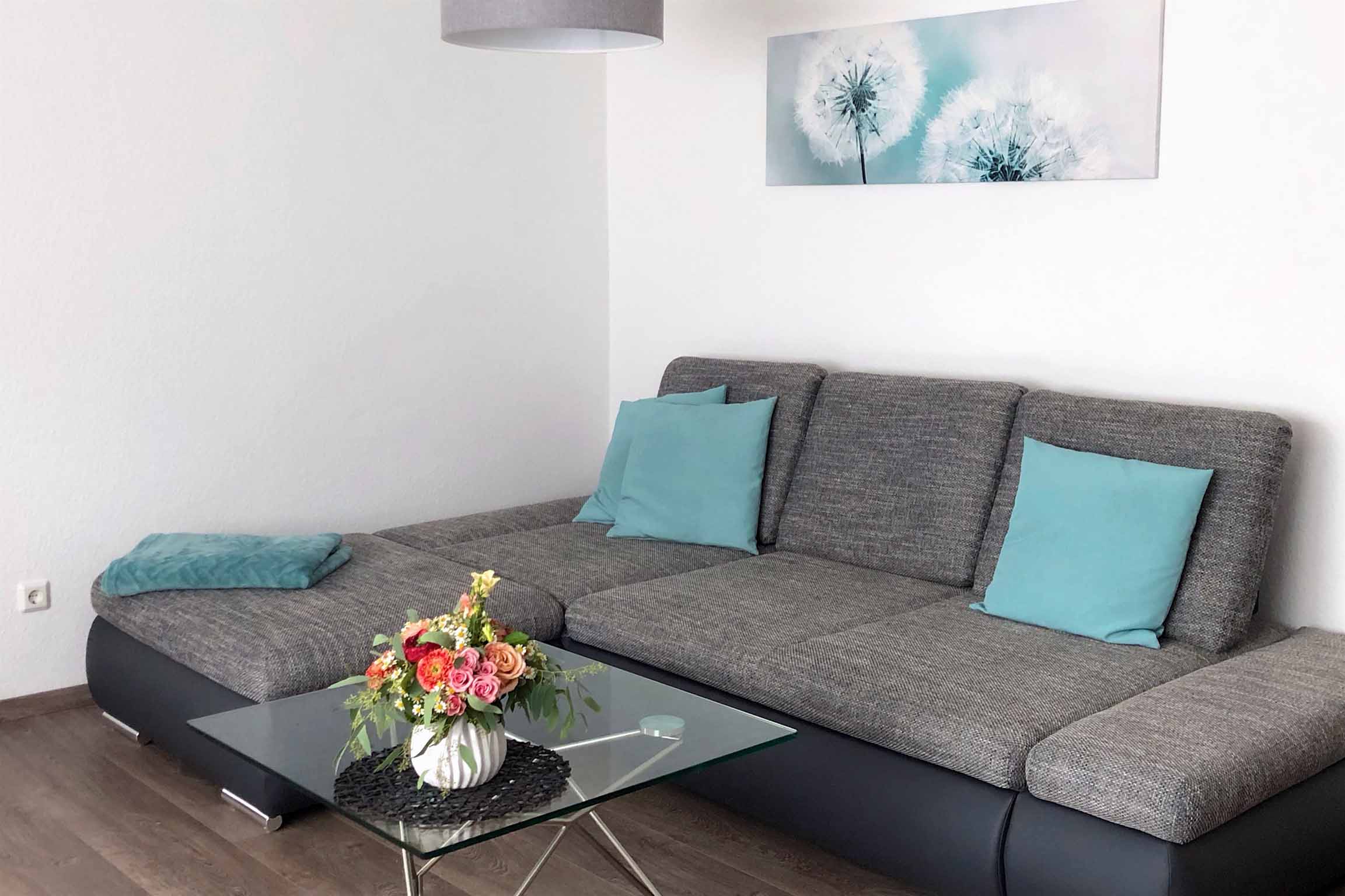 Wohnen: Couch mit verstellbaren Rückenlehnen und Seitenteil. Fernseher mit SAT-Anschluss 42 Zoll, dekorativer Glastisch, dimmbare Deckenlampe, Zugang zur Terrasse. Blick zur Rhön (Kreuzberg) frei.