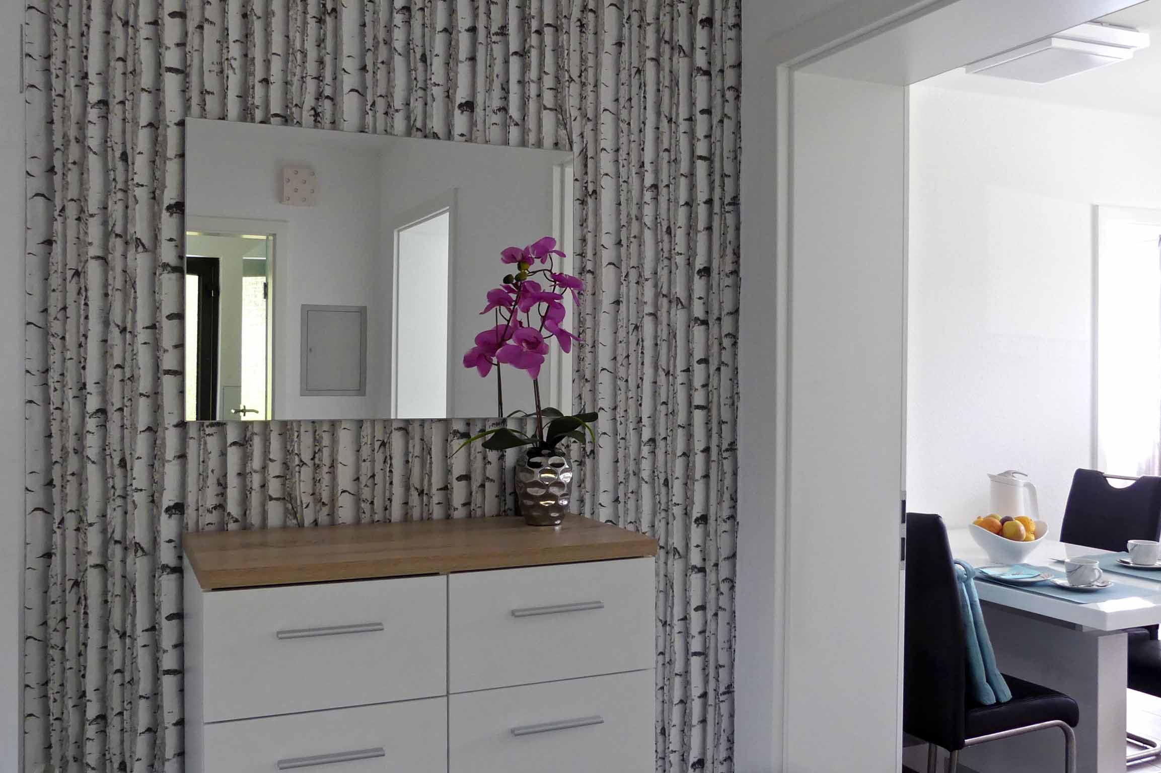 Diele/Flur: Garderobe mit Schrank, Schuhablage, kompaktes Highboard mit viel Stauraum, Flur ist der Diele vorgelagert und durch eine Glastür getrennt.
