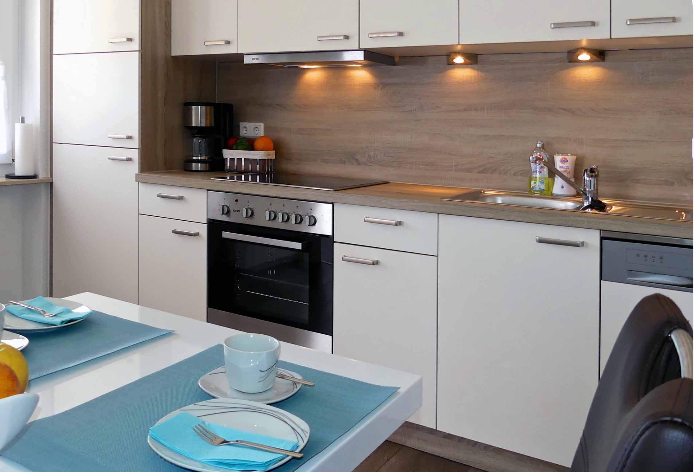 Küche: Küchenzeile mit Herd, Ceranfeld, Backofen, Spülmaschine, Kühlschrank mit Gefrierfach, Wasserkocher, Mikrowelle, Toaster, Kaffeemaschine + Cremesso- Kapselmaschine, Geschirr, Gläser, Besteck, Geschirrtücher, Tisch mit 4 bequemen Stühlen. Kurzer Zugang zur Terrasse über Wohnzimmer.