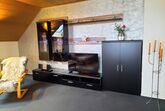 Wohnraum mit Wohnlandschaft und Sitz-Essgruppe mit großem Tisch. SAT-TV, Radio-Stereo-Musikanlage, WLAN kostenlos.
