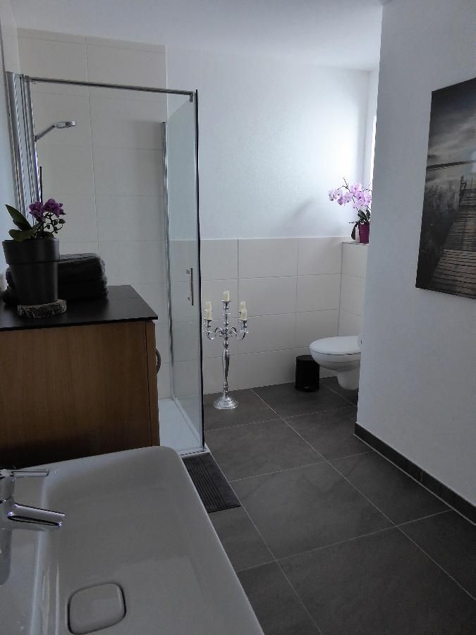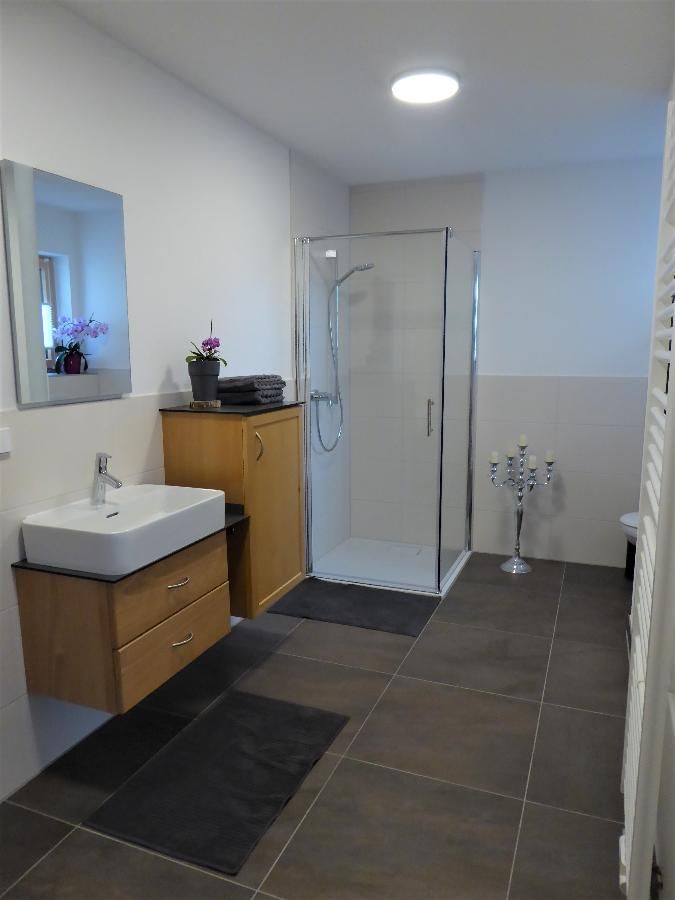 - Großzügiges Tageslichtbad mit Fußbodenheizung, Handtuchheizkörper und Dusche