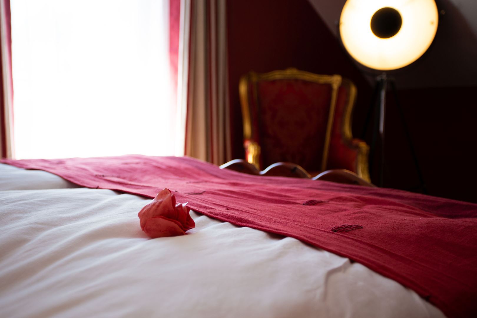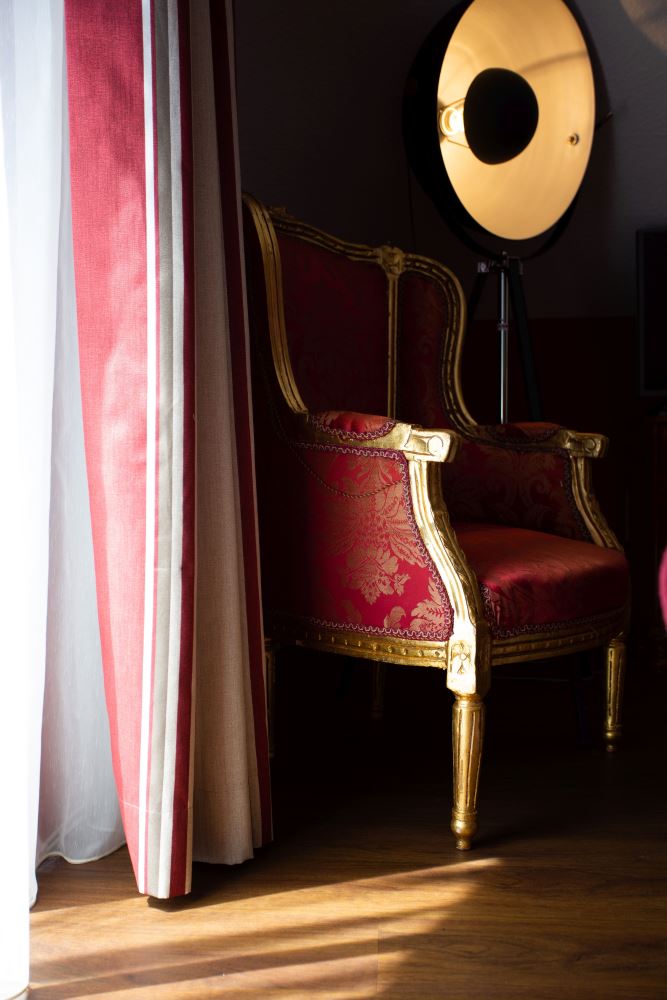1 Schlafzimmer mit Doppelbett, französischem Balkon zum Innenhof, Sat-TV, Schreibtisch, Deluxe-Badezimmer in Marmor-Mosaik mit Eckbadewanne und Dusche.