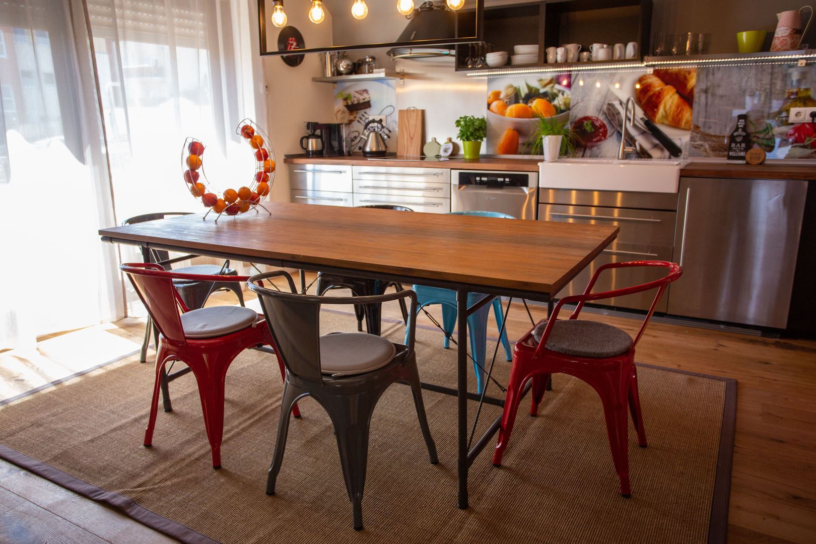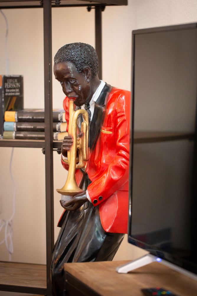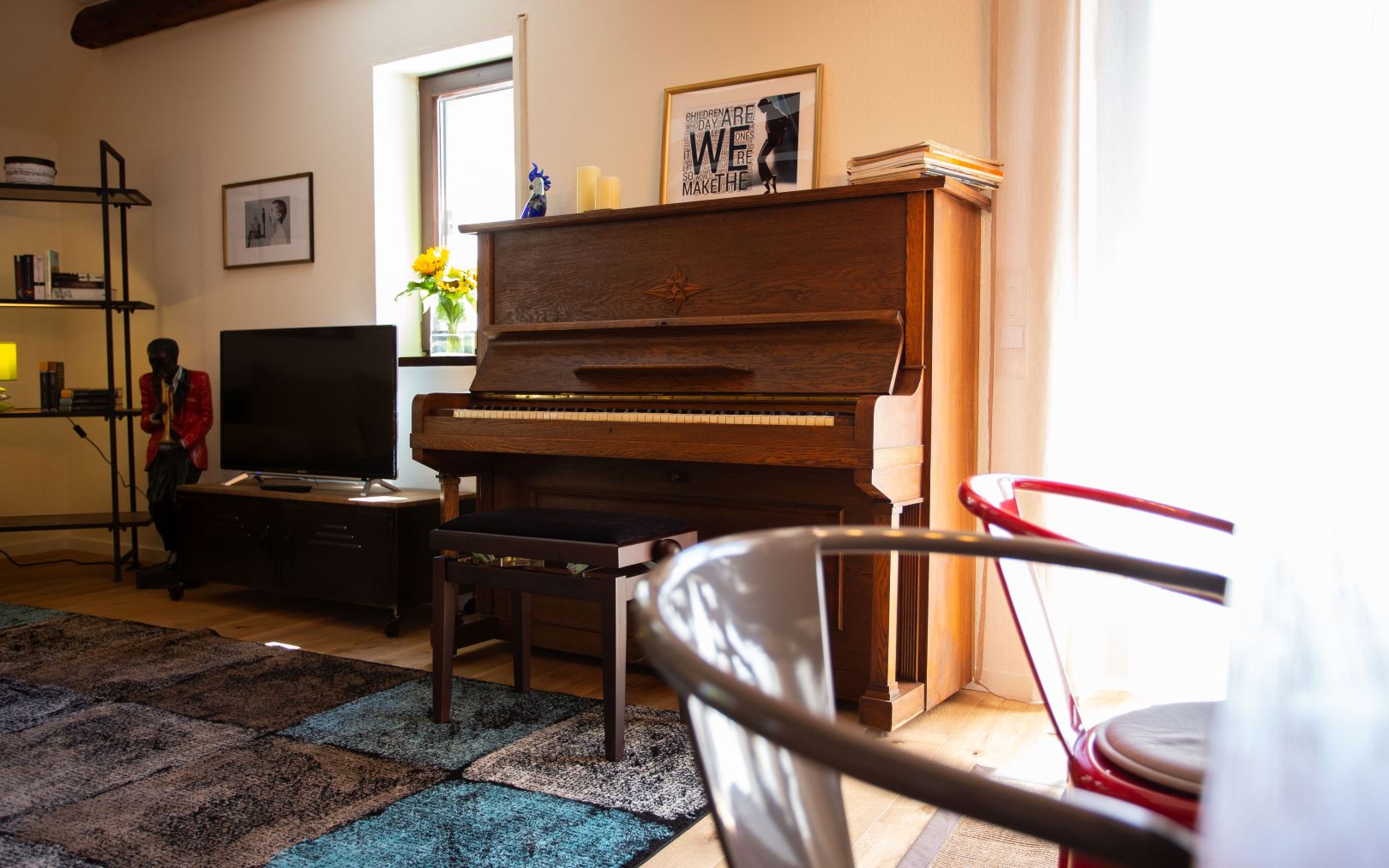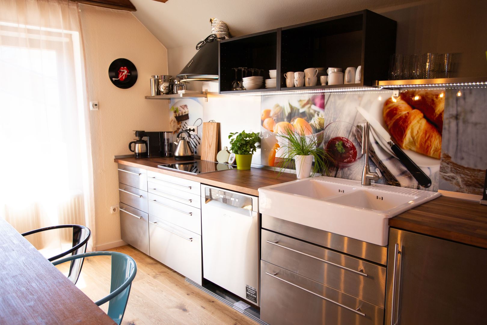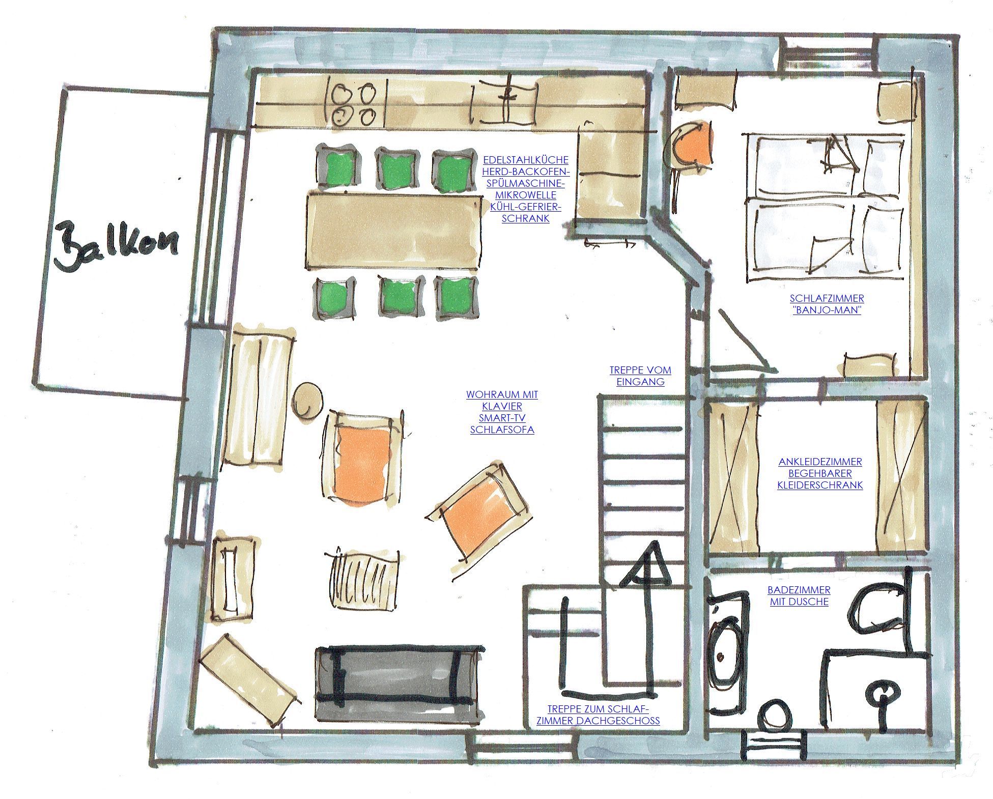Balkon zum Innenhof, großer, offener Wohnraum mit gut bespielbarem, frisch gestimmten Klavier, Sat-TV, Sitz- Lese-Ecke, Schlafsofa Edelstahlküche mit Essplatz - Vollausstattung mit Retro-Kühl-Gefrierkombination, Spülmaschine, Herd, Backofen, Mikrowelle, Geschirr, Kaffeemaschine, Toaster, Wasserkocher.