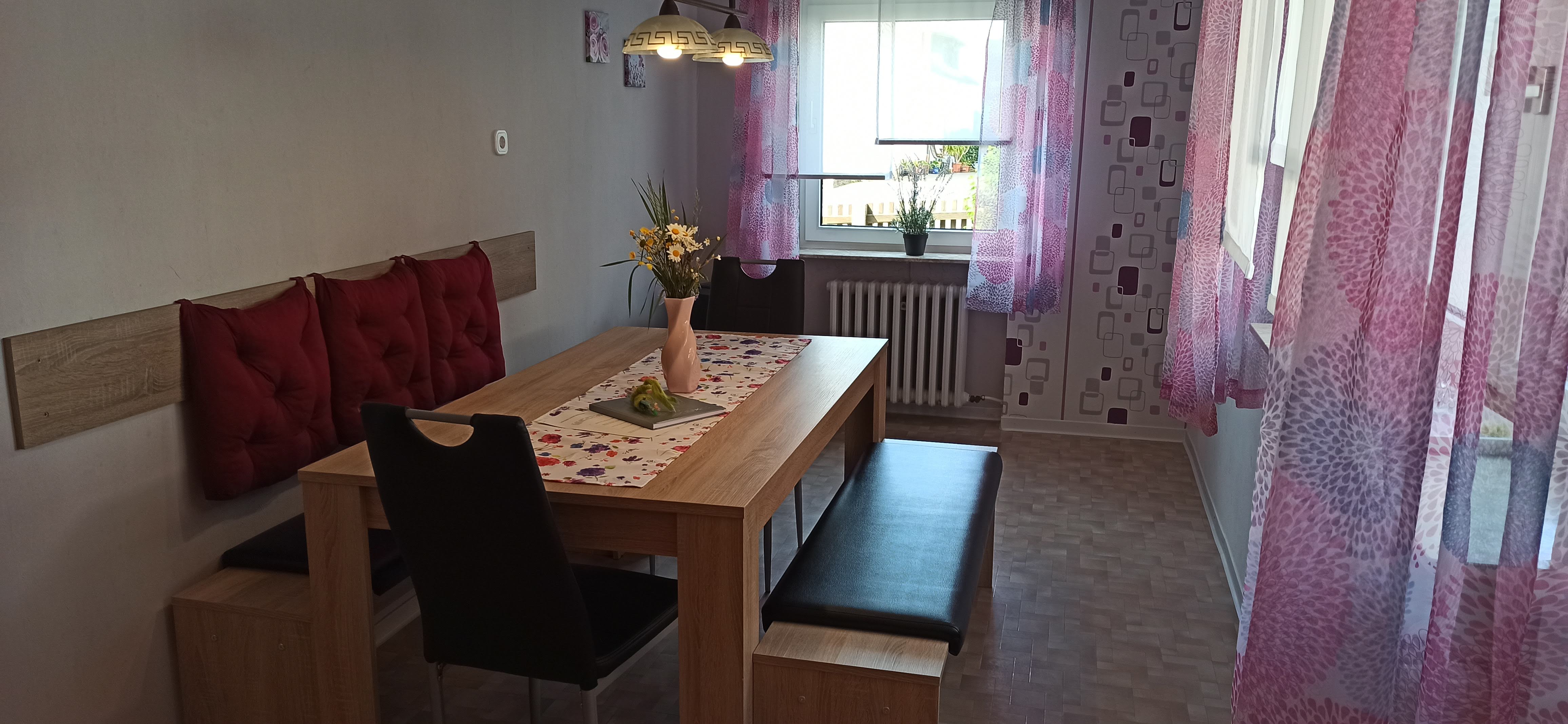 Im Erdgeschoss befindet sich ein Wohnzimmer mit Sofa und TV, ein eingerichtetes Esszimmer und eine vollausgestattete Küche mit Spülmaschine, Kaffeemaschine, Wasserkocher, Kühlschrank mit Gefrierfach, Backofen, Toaster, Brotschneidemaschine, Pürierstab und uvm.