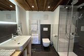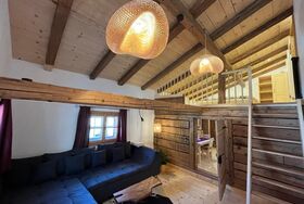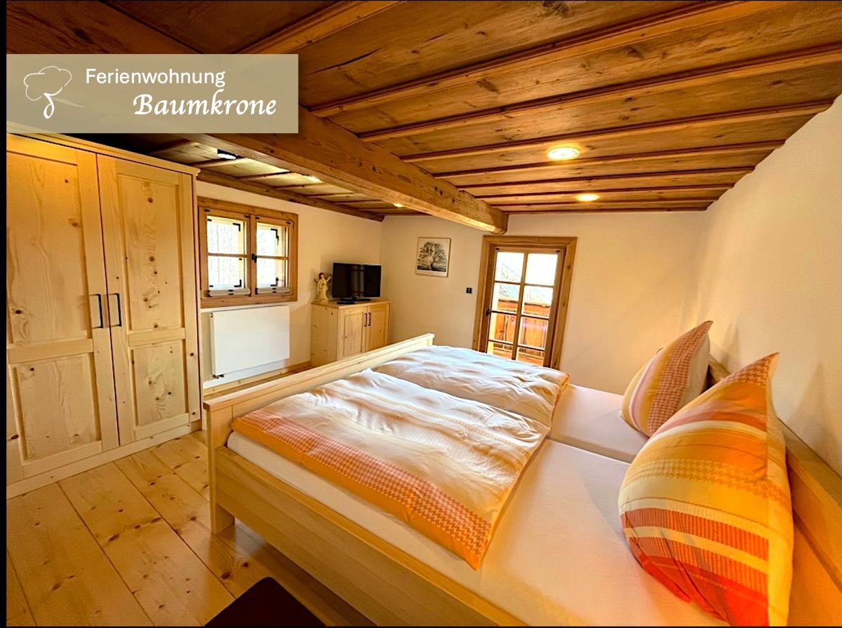 Das größte Apartment bietet Platz für 4 Erwachsene und erstreckt sich über die gesamte Länge des Hauses. Durch eine Veränderung der Raumaufteilung bietet sich Platz für ein Wohnzimmer, Schlafzimmer und eine Küche. Die große Eckbank in der Küche lädt zu einer gemütlichen Runde mit bayerischem Spezialitäten ein! Das Wohnzimmer wurde bis zum Dachstuhl geöffnet und ermöglicht über eine Treppe den Zugang zur Galerie. Hier steht ein weiteres Doppelbett und alternativ ein Matratzenlager für mehrere Kinder zur Verfügung. Ebenso sorgt die Beleuchtung für ein uhriges Heutstadl-Gefühl!