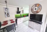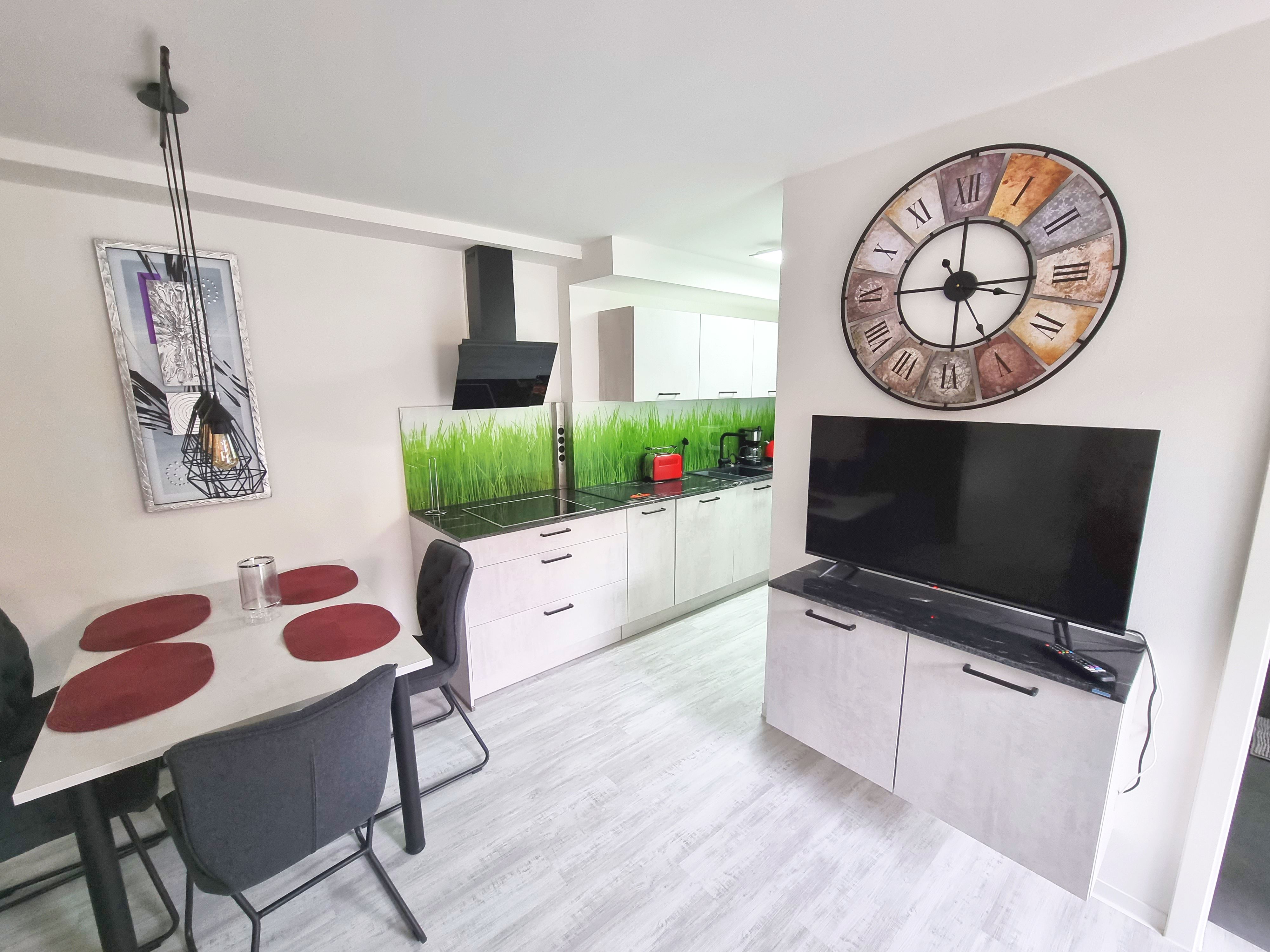 Unsere modern eingerichtete Ferienwohnung Lila Versuchung mit 46m² Wohnfläche, verfügt über ein schönes Schlafzimmer, ein Wohnzimmer mit Wohnküche und ein geräumiges Badezimmer mit Whirlpool-Badewanne und Regenwalddusche. Im Schlafzimmer befindet sich ein Bockspringbett. Im Wohnbereich befindet sich zusätzlich noch ein Kinderhochbett.