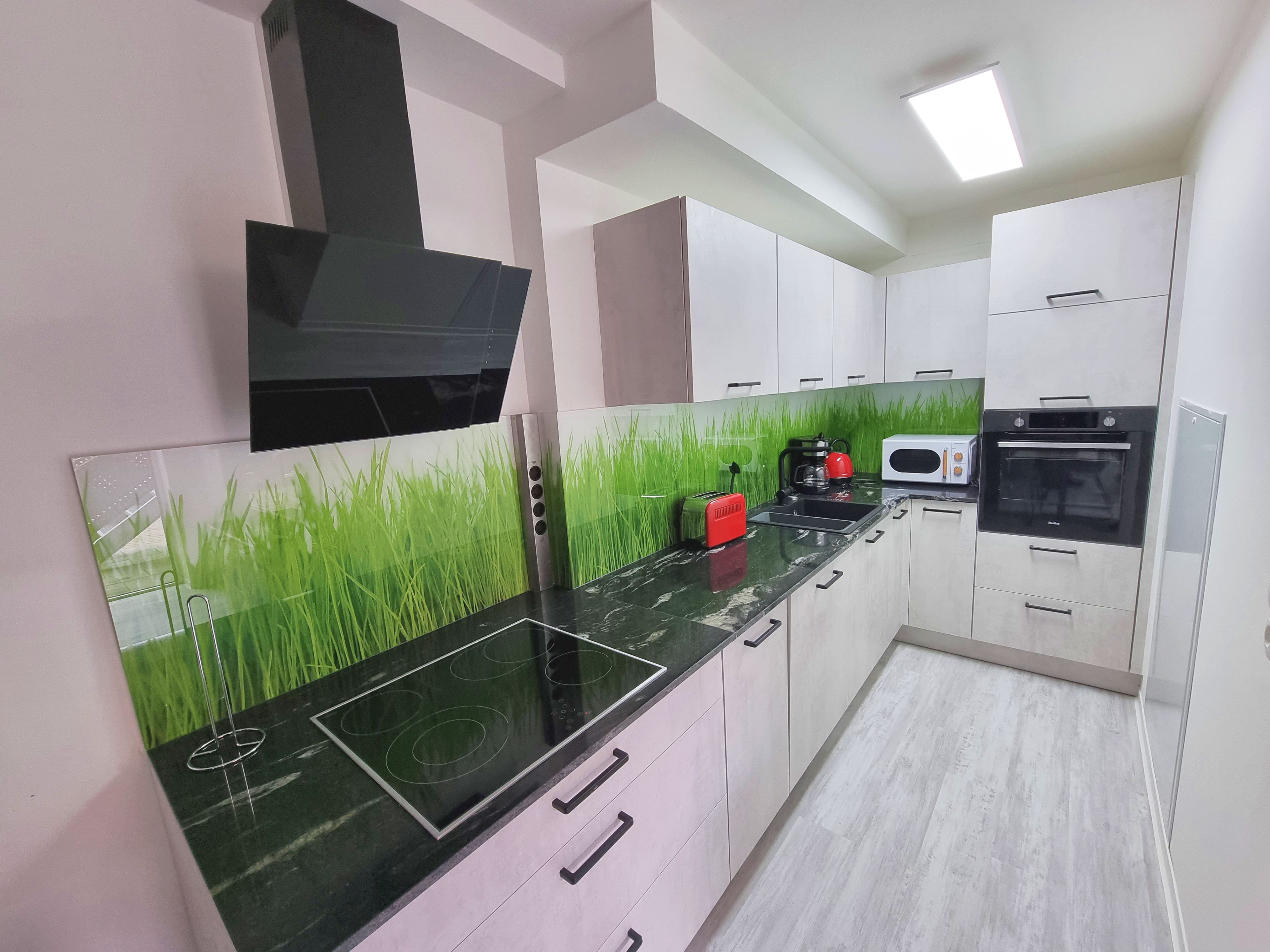 Vollausgestattete Küche mit Toaster, Töpfe, Pfannen, Besteck, Mikrowelle, Wasserkocher, Backofen, Herd mit Ceran-Kochfeld, Kaffeemaschine, Geschirr, Gläser, Spültücher,...