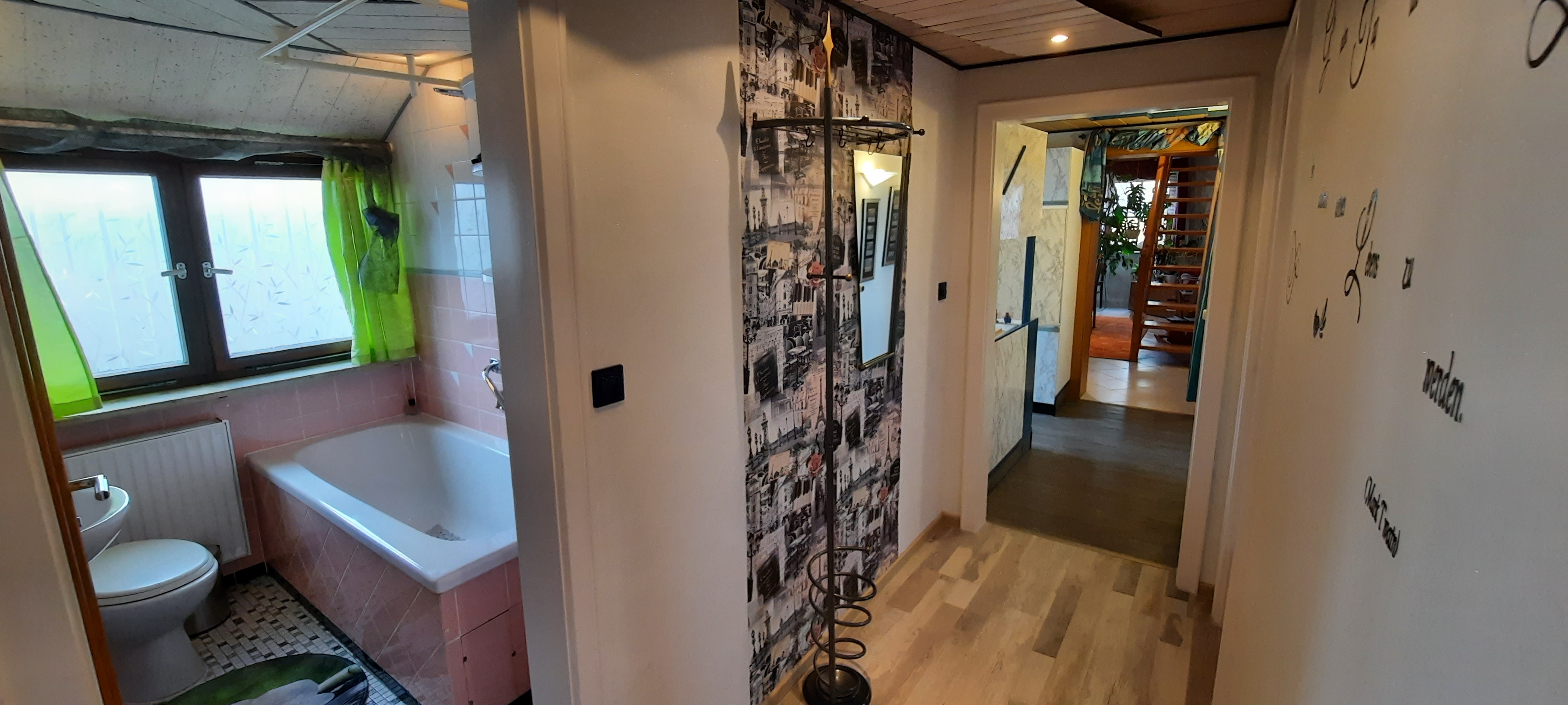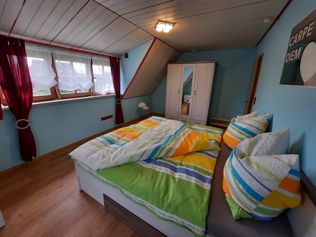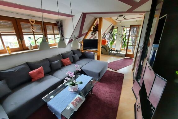 Die 80 m² große Ferienwohnung liegt im oberen Stock unseres Hauses und ist über drei Treppenstufen am Hauseingang und eine Etagentreppe im Haus erreichbar. Wir als Gastgeber wohnen im Erdgeschoss.