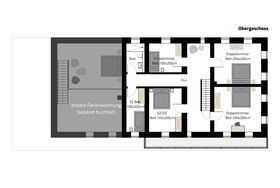 Im Erdgeschoss befindet sich ein Bad, die Küche, das Wohnzimmer und ein Abstellraum mit Waschmöglichkeit. Im Obergeschoss gibt es 5 Schlafzimmer eine Leseecke und ein weiters Bad.