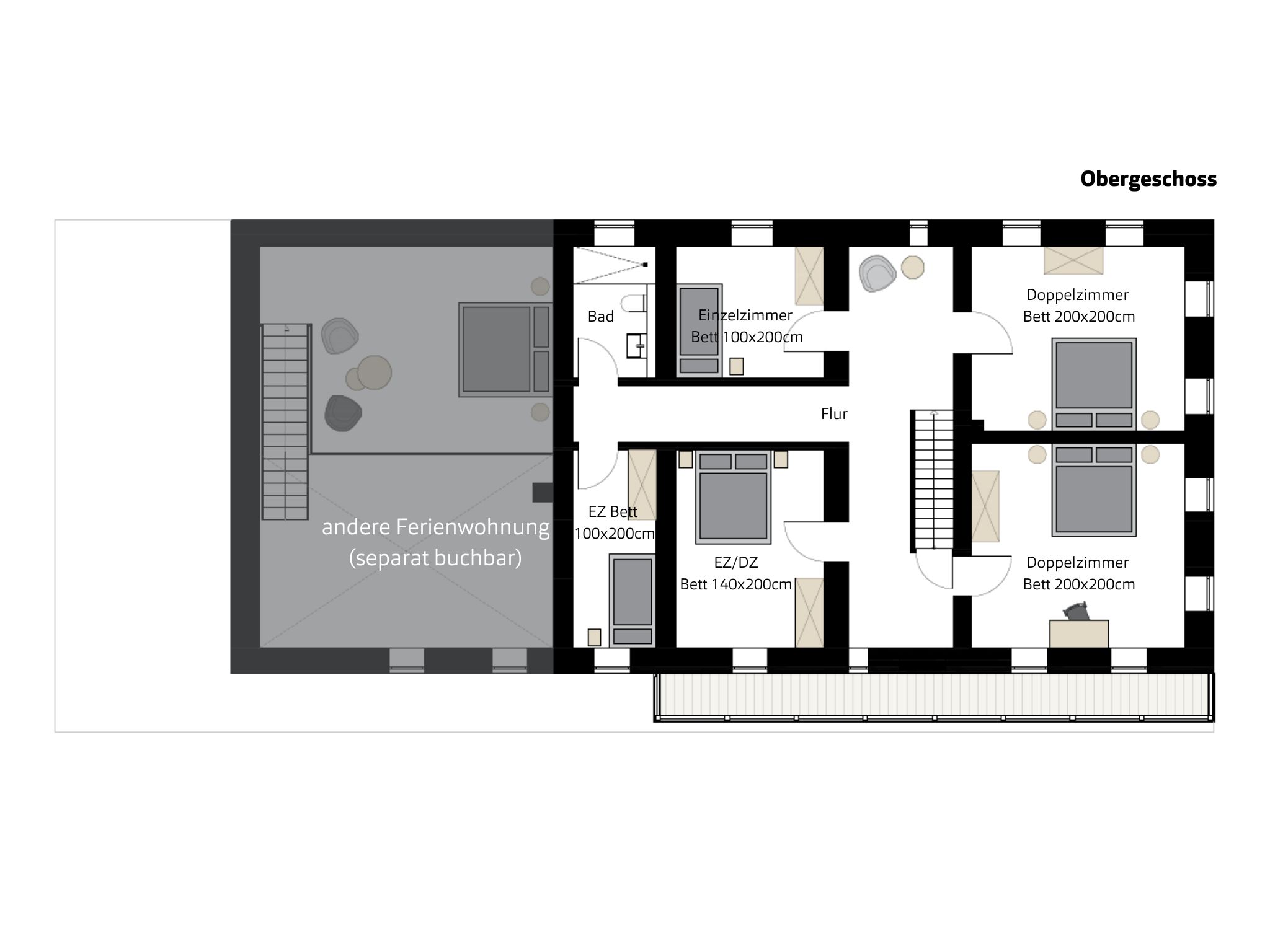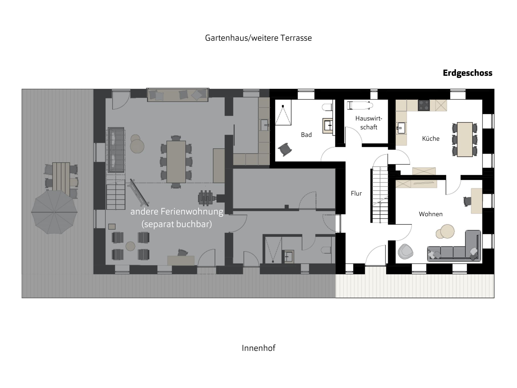 Unseren Gästen steht das ganze Haus zur freien Verfügung. In einem anderen Gebäudeteil befindet sich eine weitere, komplett separate Ferienwohnung,das Atelier, für zwei Personen. Das Atelier kann separat oder auch zusätzlich zum Haupthaus gebucht werden. Im Hof ist ein Carport vorhanden. Ebenso kann auf dem gesamten Hof geparkt werden.