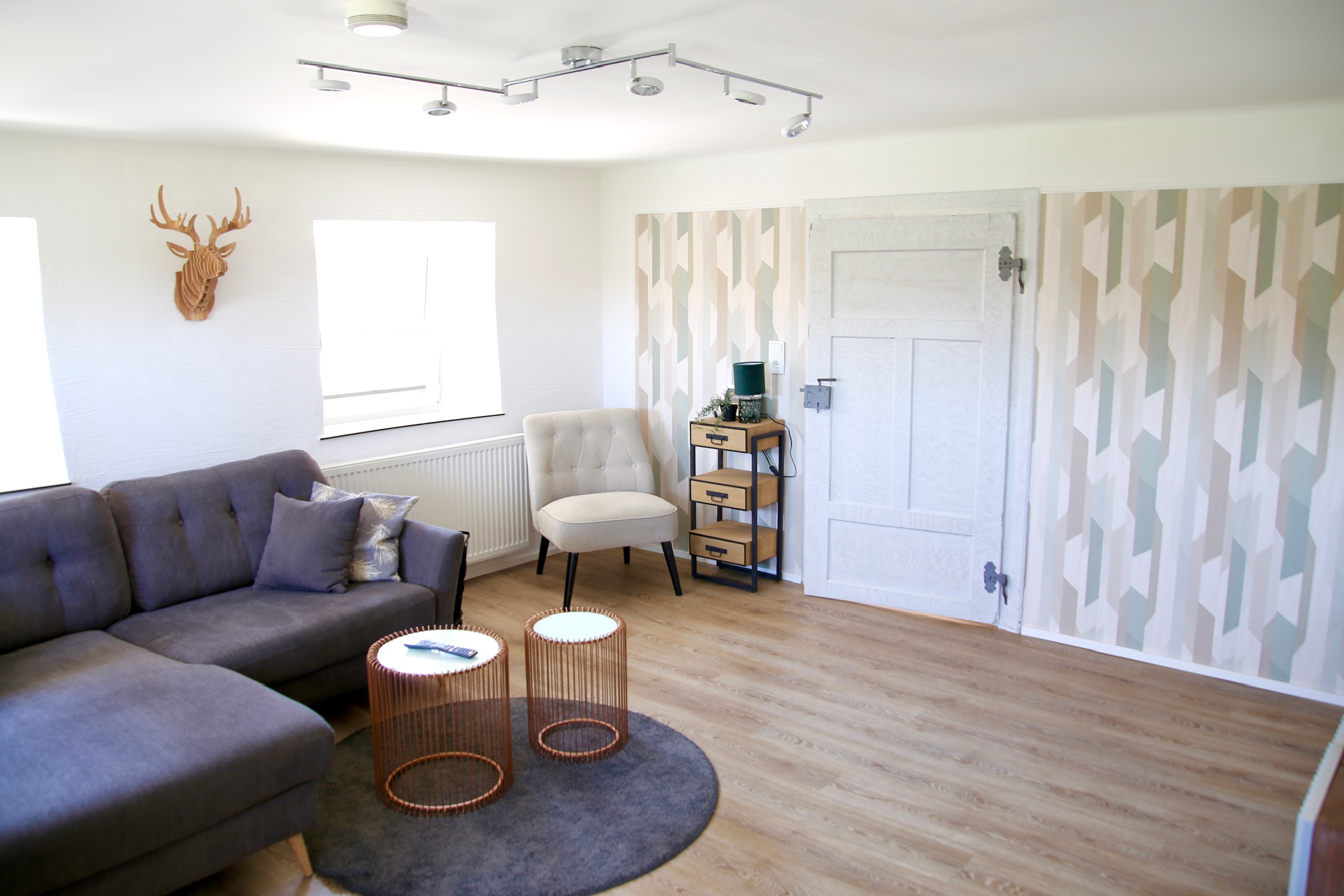 Wohnzimmer mit Couch, Fernseher und Sekretär