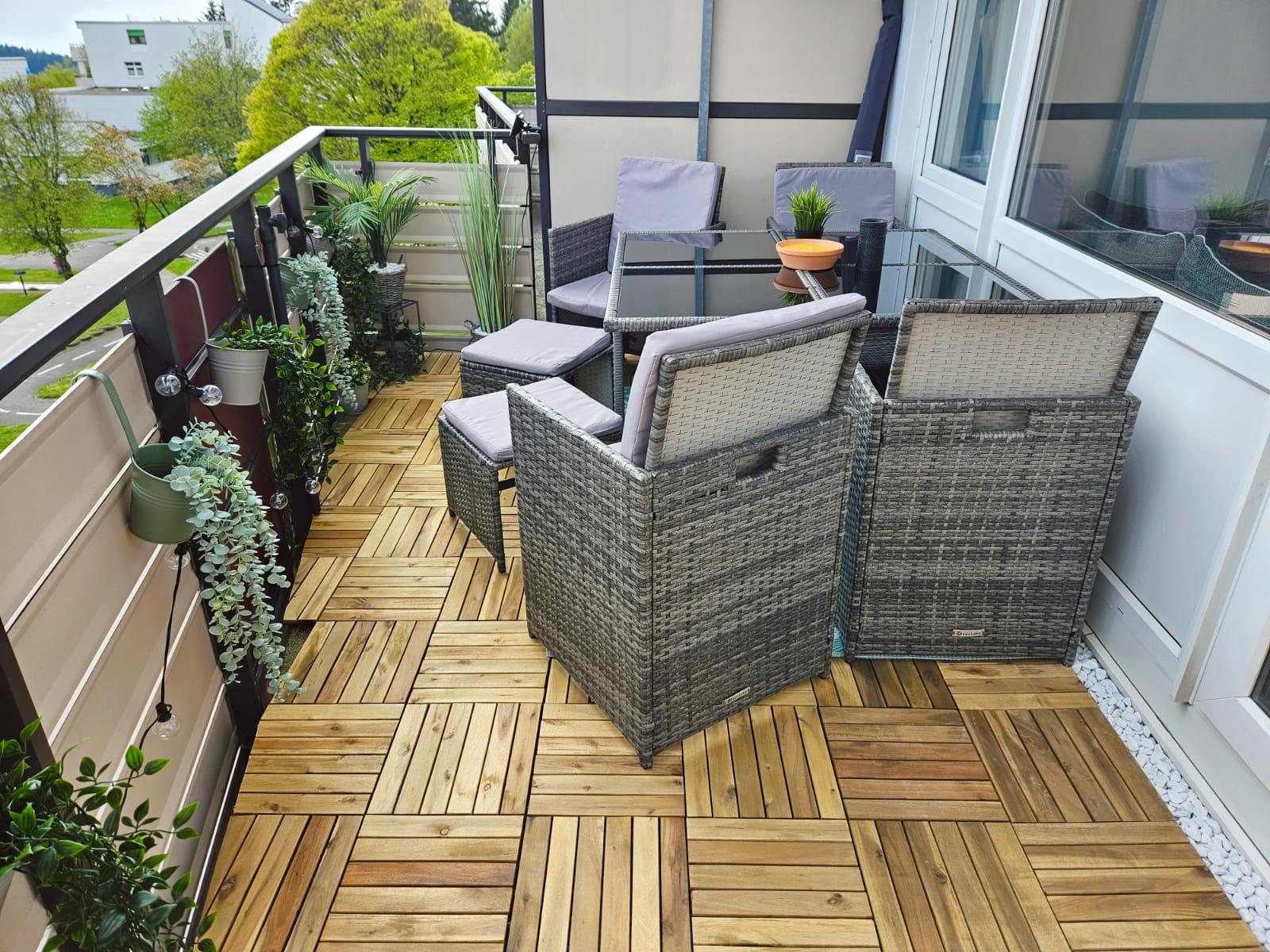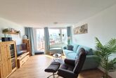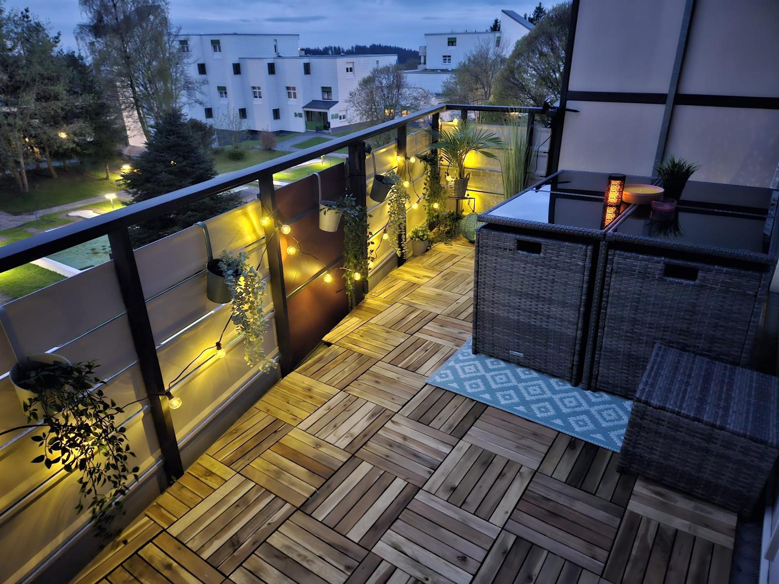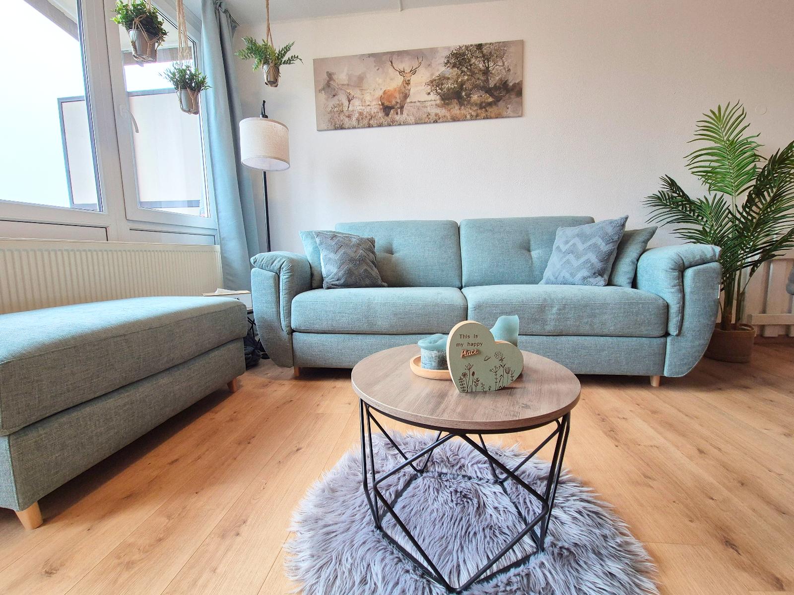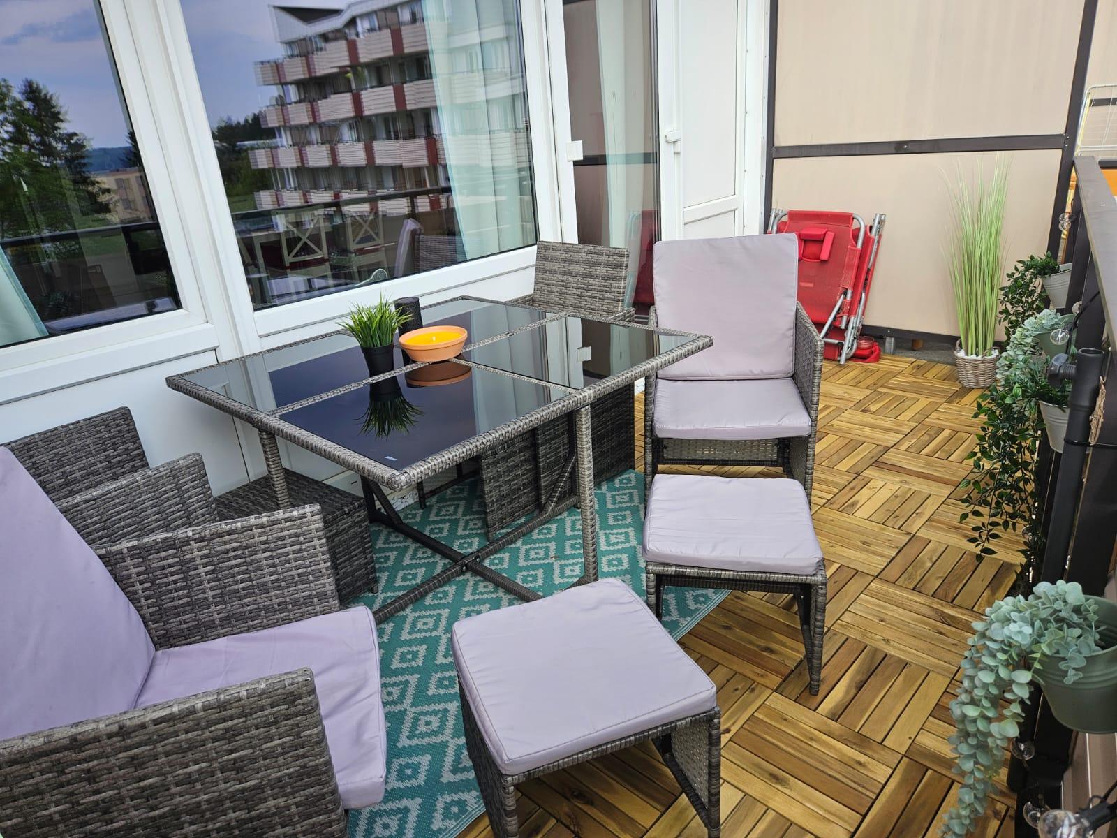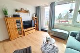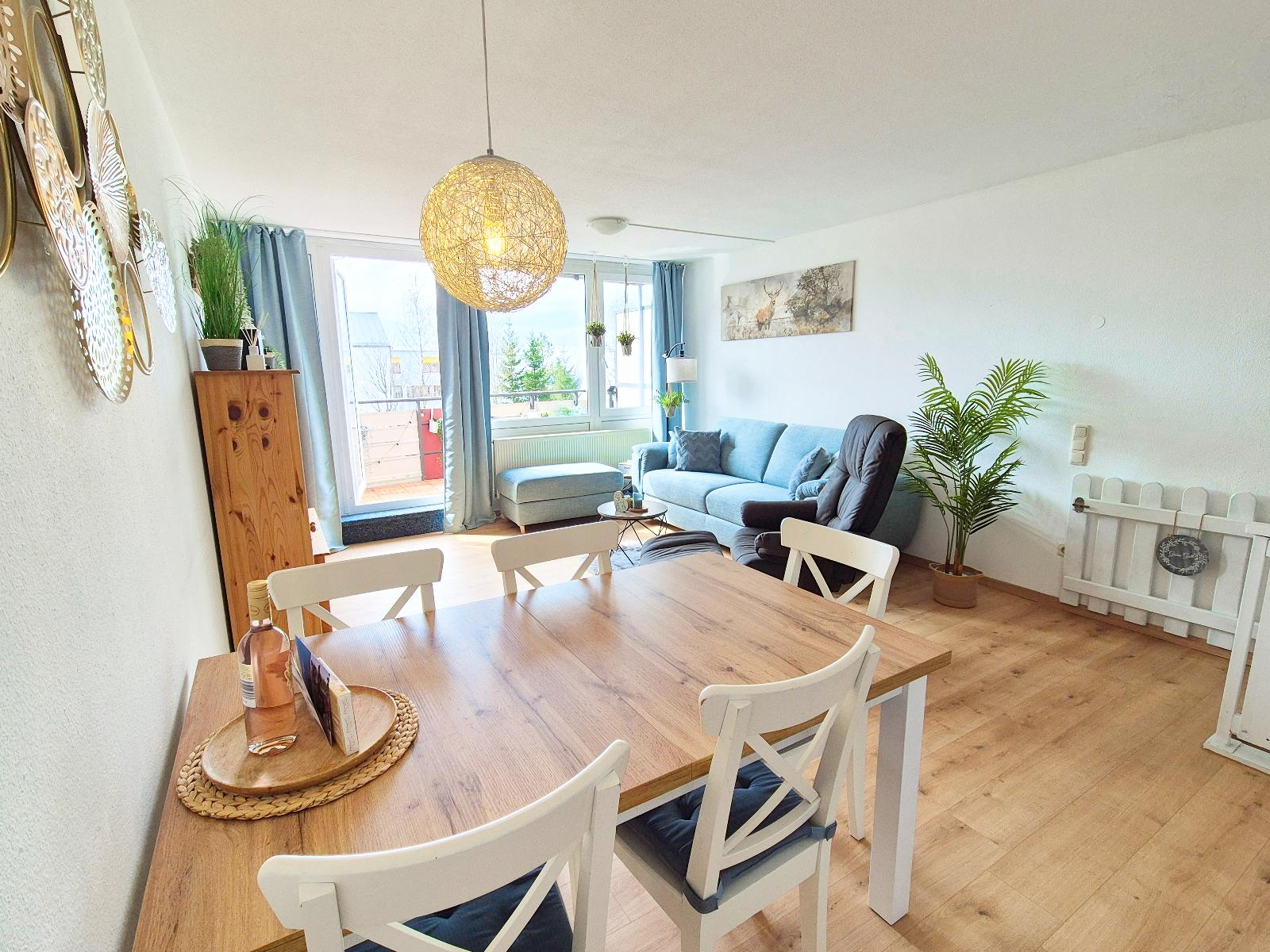 Über eine Treppe gelangen Sie in den hellen Wohnbereich mit vollausgestatteter Küchenzeile. Der Wohnbereich verfügt über einen sonnigen Südbalkon. Dieser ist neu gestaltet und mit ruhigem Blick auf den Minigolfplatz, welcher abends beleuchtet und somit auch schön anzusehen ist. Dank der gemütlichen Sitzgruppe kann man hier auch gemütlich essen, Spiele spielen, einfach die Sonne genießen oder den Abend entspannt ausklingen lassen. Zurück im Wohnbereich finden Sie die gemütliche Couch, die sich super einfach zu einem vollwertigen Bett (1,60m Liegefläche) mit Lattenrost und Matratze umwandeln lässt, einen Smart-TV mit Netflix und Disney+, Radio mit großer Auswahl an Kinder-CDs und viele Bücher und Spiele für Groß und Klein. So kommt auch bei schlechtem Wetter gewiss keine Langeweile auf.