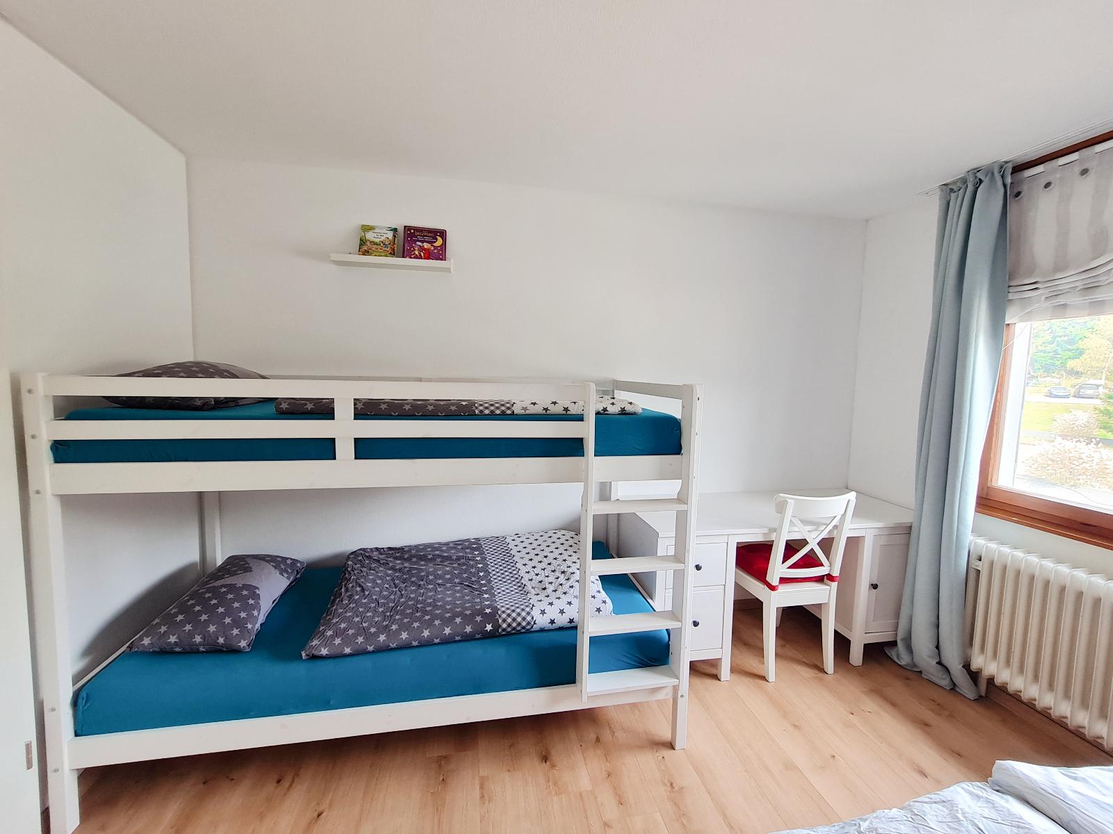 Zu guter Letzt geht es noch ins Schlafzimmer. Hier finden Sie ein 1,80 großes Boxspringbett, ein Etagenbett, einen großen Kleiderschrank und einen Schreibtisch.