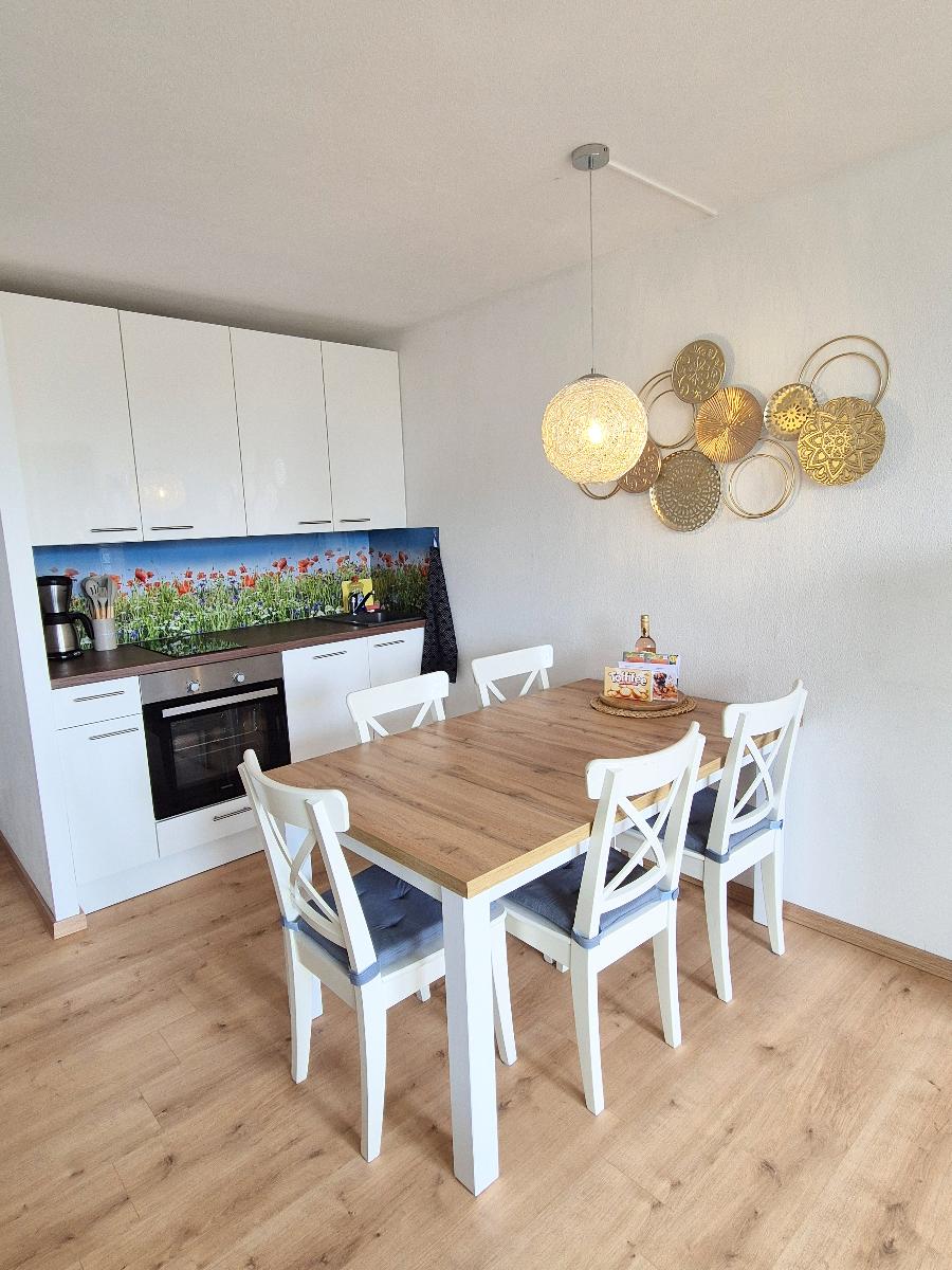 Die Küchenzeile lässt mit Ceran-Kochfeld, Backofen, Geschirrspüler, Kaffeemaschine, Wasserkocher, Mikrowelle und Toaster keine Wünsche offen. Ein großer Kühlschrank mit Gefrierfach ist natürlich auch vorhanden. Der Esstisch ist groß genug um neben dem gemeinsamen Essen auch tolle Familienspiele zu spielen.