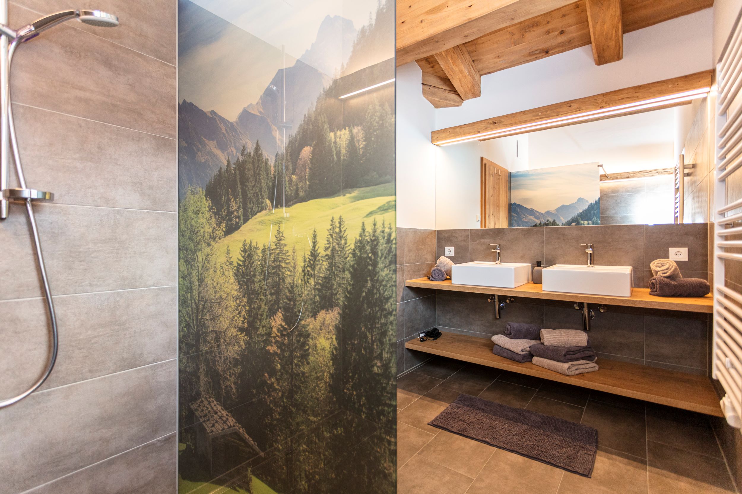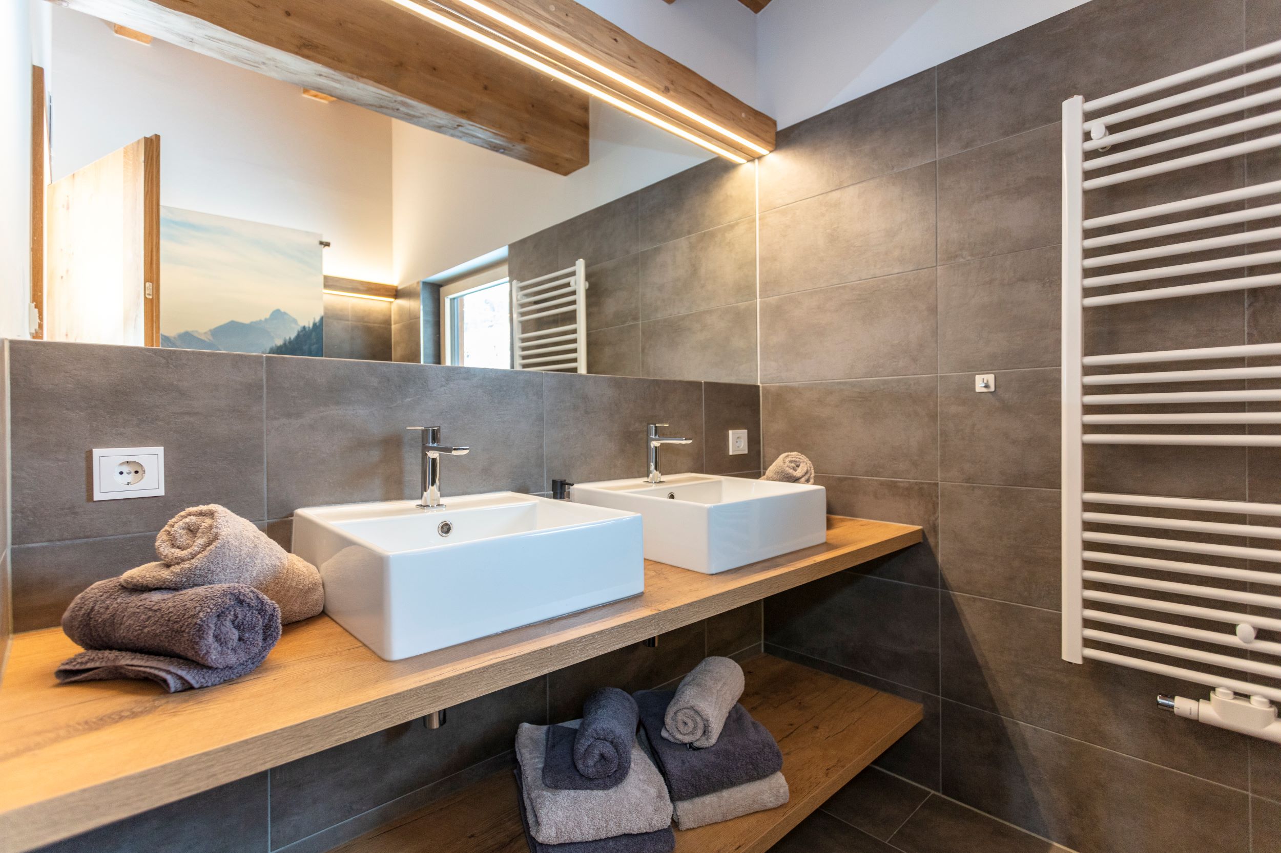 • Bad mit großzügiger Dusche, Handtuchtrockner, Doppelwaschbecken und Fön