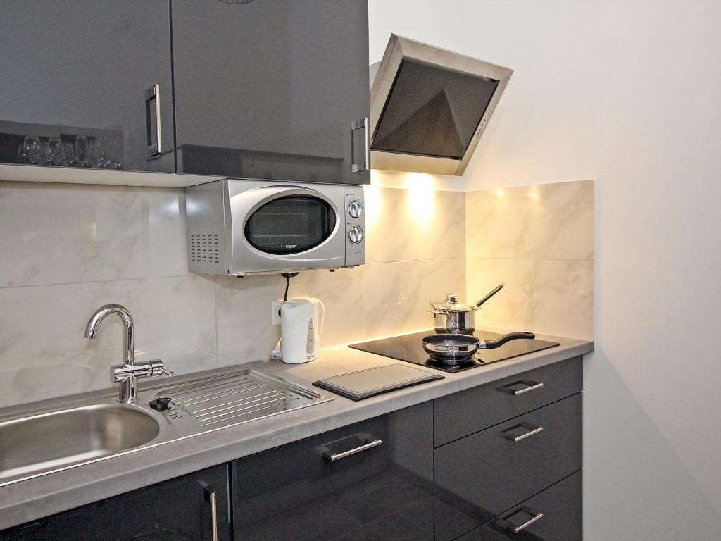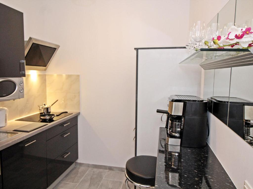 Kleine, offene Küche (Backofen, Geschirrspüler, 4 Glaskeramikherd Platten, Mikrowelle, elektrische Kaffeemaschine).