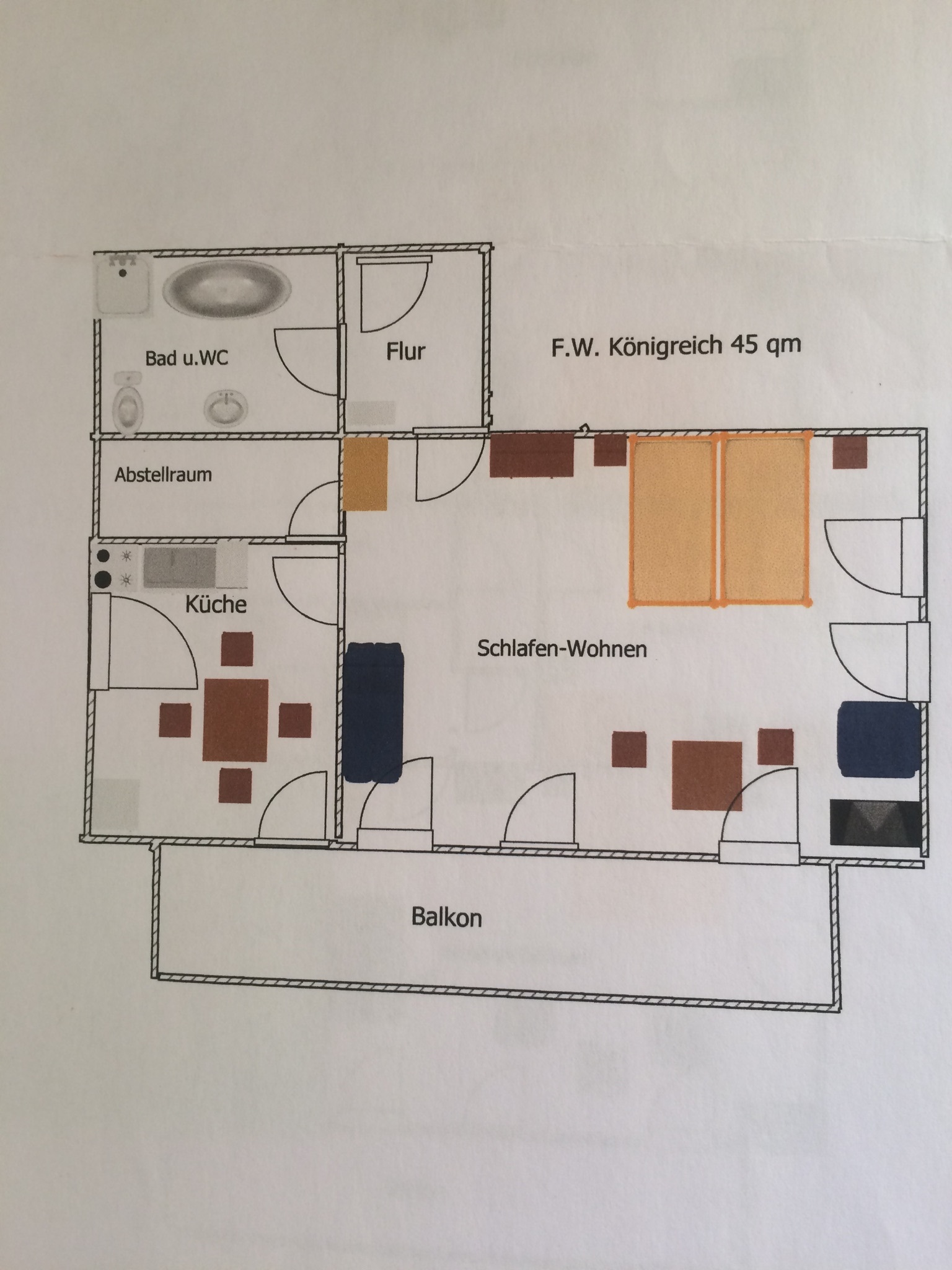 Unsere Ferienwohnung Königreich ist ca. 60qm groß und bietet Platz für bis zu 3 Personen. Die Ferienwohnung verfügt über einen kombinierten Wohn-Schlafraum (ca. 35qm) mit einem Doppelbett, einer Sitzgruppe und einem TV. Von hier gelangen Sie auf den Balkon. Die Küche ist voll ausgestattet mit einem Kühlschrank mit Gefrierfach, einer Mikrowelle, einer Geschirrspülmaschine, sowie einem Toaster und einer Kaffeemaschine. Das Bad verfügt über eine Dusche, ein WC sowie ein Waschbecken. Parkplatz und Wlan stehen kostenfrei zur Verfügung. Die Wohnung ist eine Nichtraucherwohnung.
