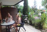 Überdachte Südterrasse mit direkten Zugang zur Liegewiese, Garten und Parkplätze.