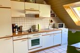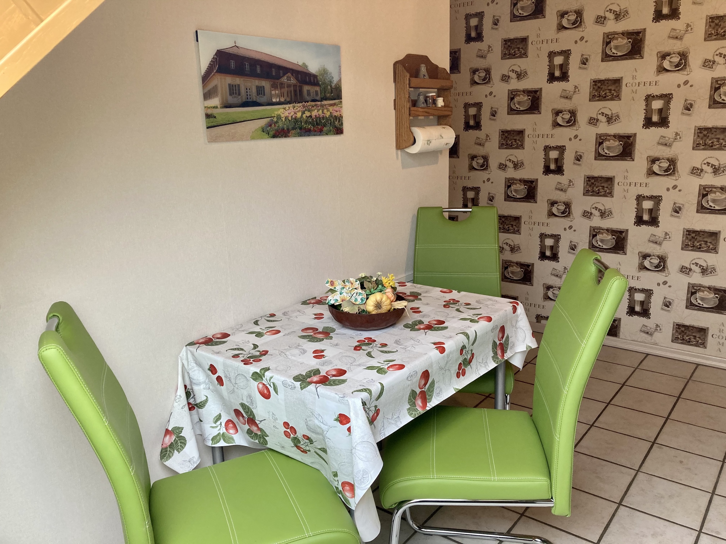 Wohnküche mit Spülmaschine, Mikrowelle, Herd, Backofen, genügend Küchenutensilien, Kühlschrank mit Eisfach, Essecke,