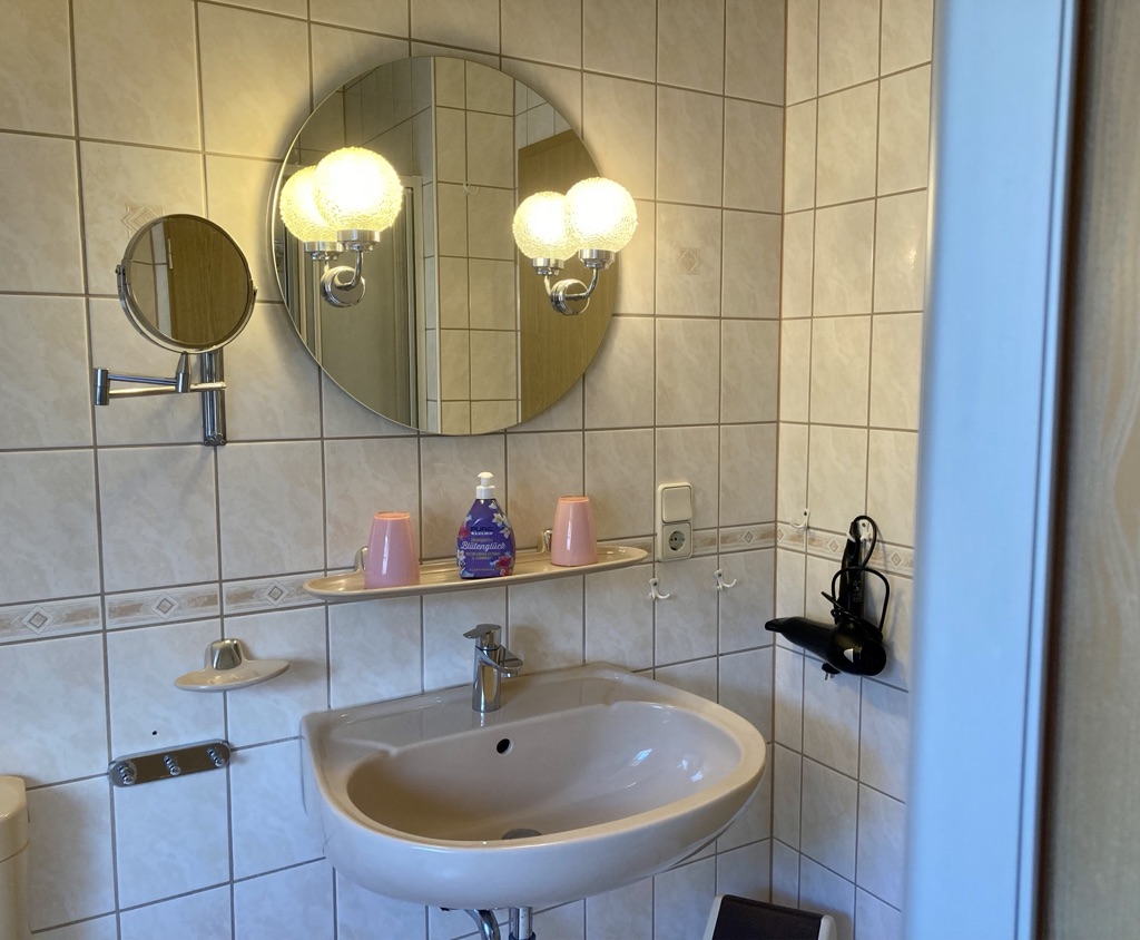 Bad/DU/WC mit Haltegriffen, Duschmatte, Duschhocker, große Ablage, Spiegel, Fön.
